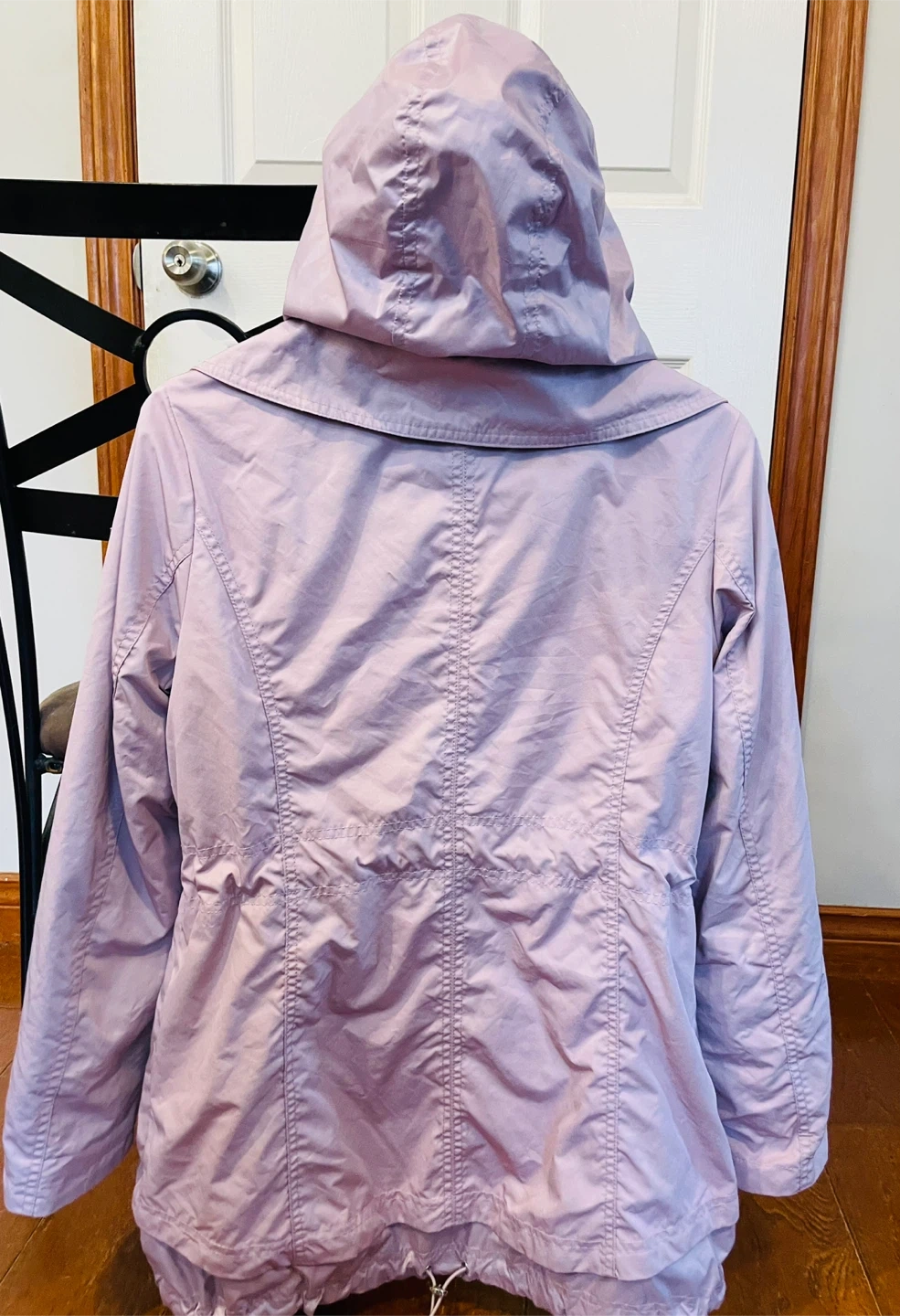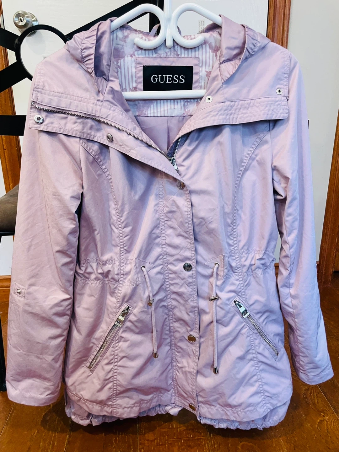 Selling a gently used Guess rain jacket in a lovely lavender colour. It's a size medium and features a hood, zipper and button closure, and drawstring at the waist. Perfect for that cool spring weather or those rainy days!