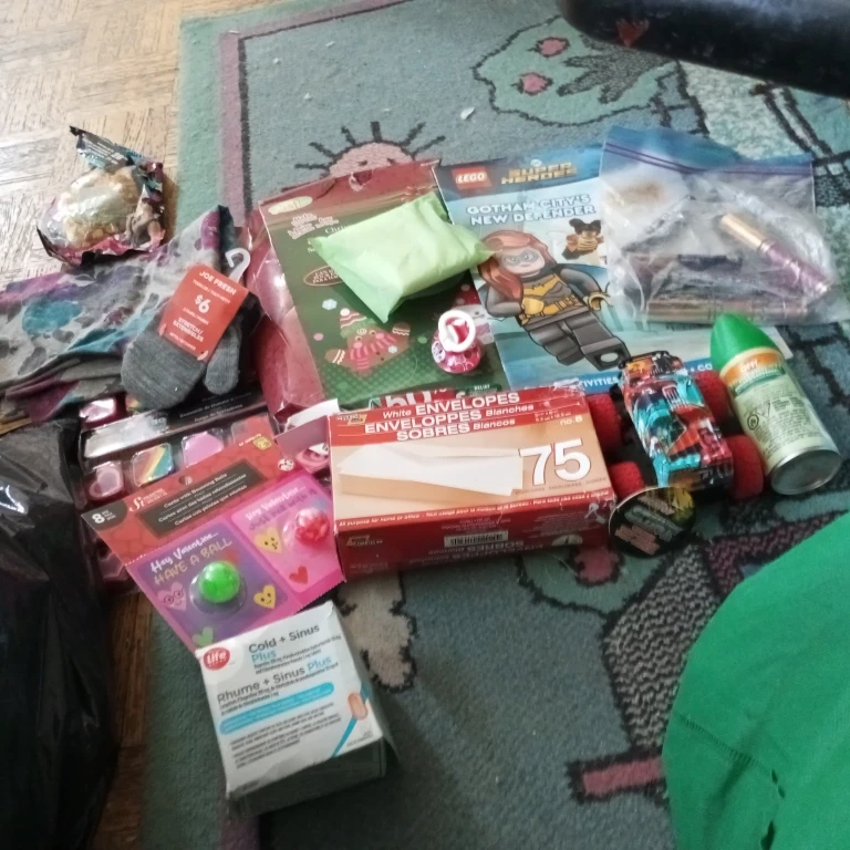 This bundle includes a variety of items, featuring a LEGO Super Heroes set and a Lululemon Team Canada tote bag. You'll also find Joe Fresh socks, a Life Brand Cold + Sinus Plus box, and other small packaged goods. It's a great collection of everyday essentials and fun items!