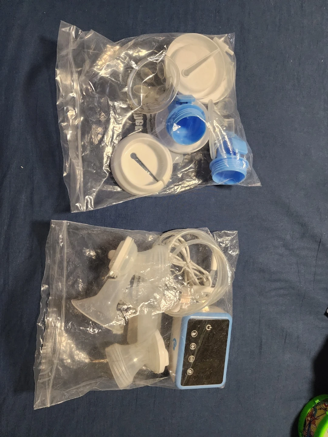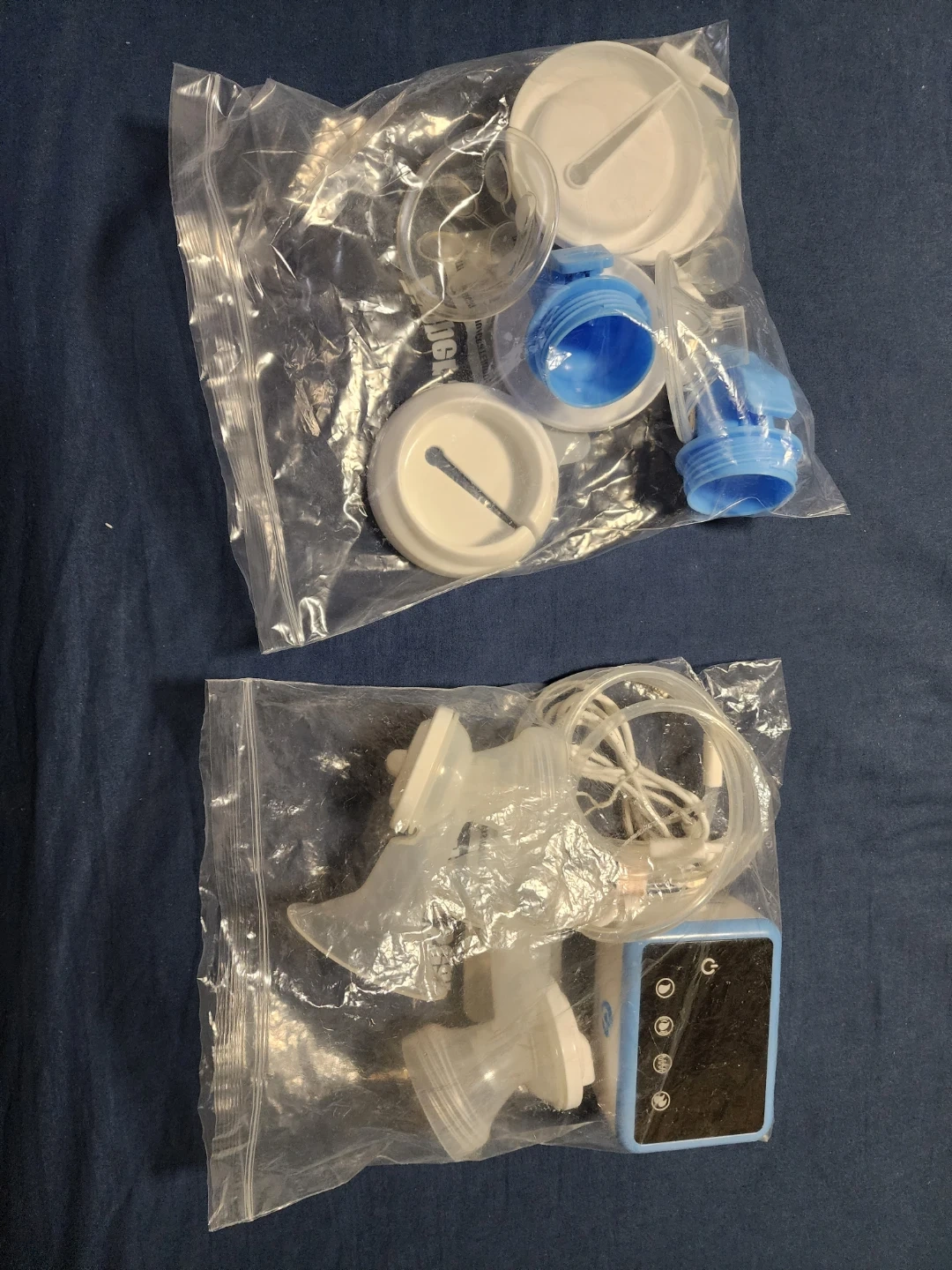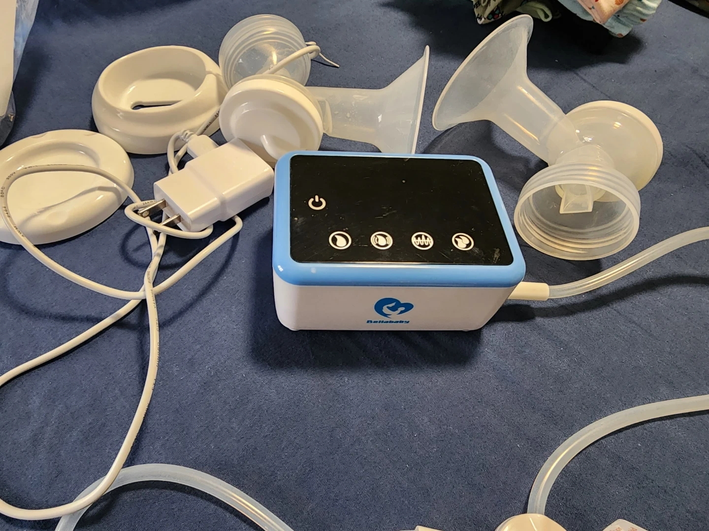 This Bellababy double electric breast pump comes with all pictured accessories. It's portable and includes a rechargeable motor unit. The pump is designed for efficient milk expression.
