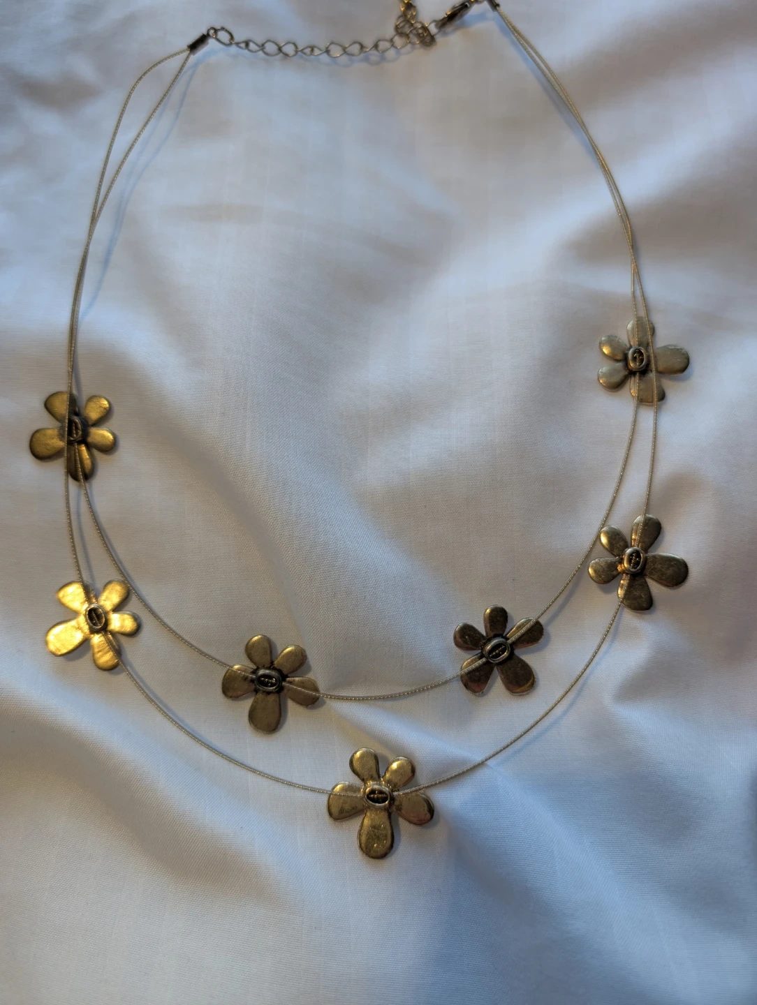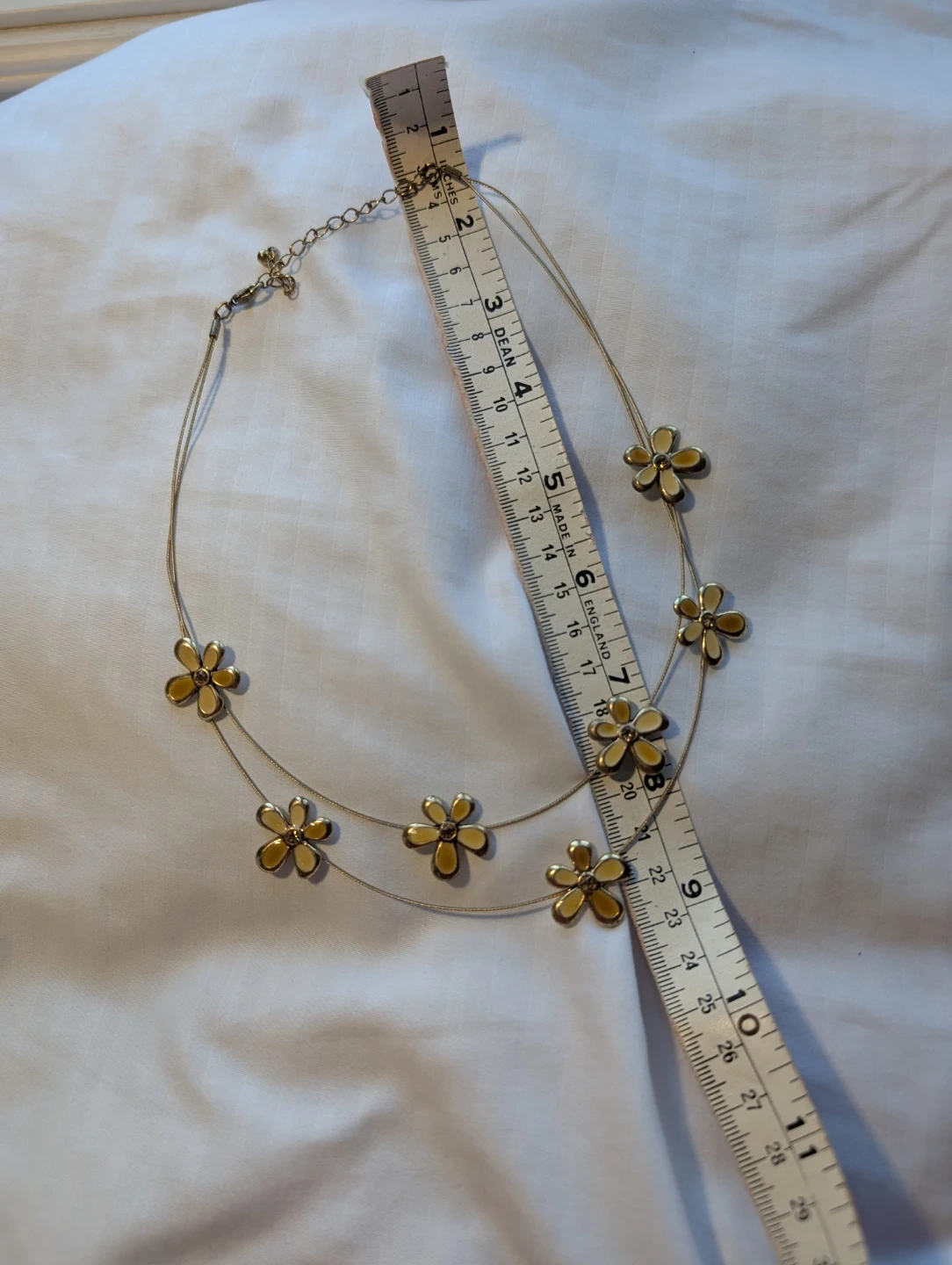 This necklace features two delicate strands adorned with small daisy-shaped charms. The overall colour is a soft gold tone, with yellow and off-white enamel detailing on the flowers. The necklace has an adjustable clasp closure for a comfortable fit. It's a lovely accessory for adding a touch of floral charm to any outfit!