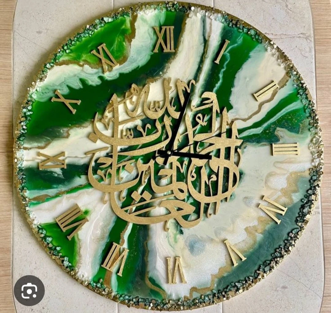 All kind of Ramadan favors available Decorative round wall clocks featuring intricate Arabic calligraphy and a marbled resin finish. It has Roman numerals for easy time-telling. This piece adds a touch of elegance to any room.