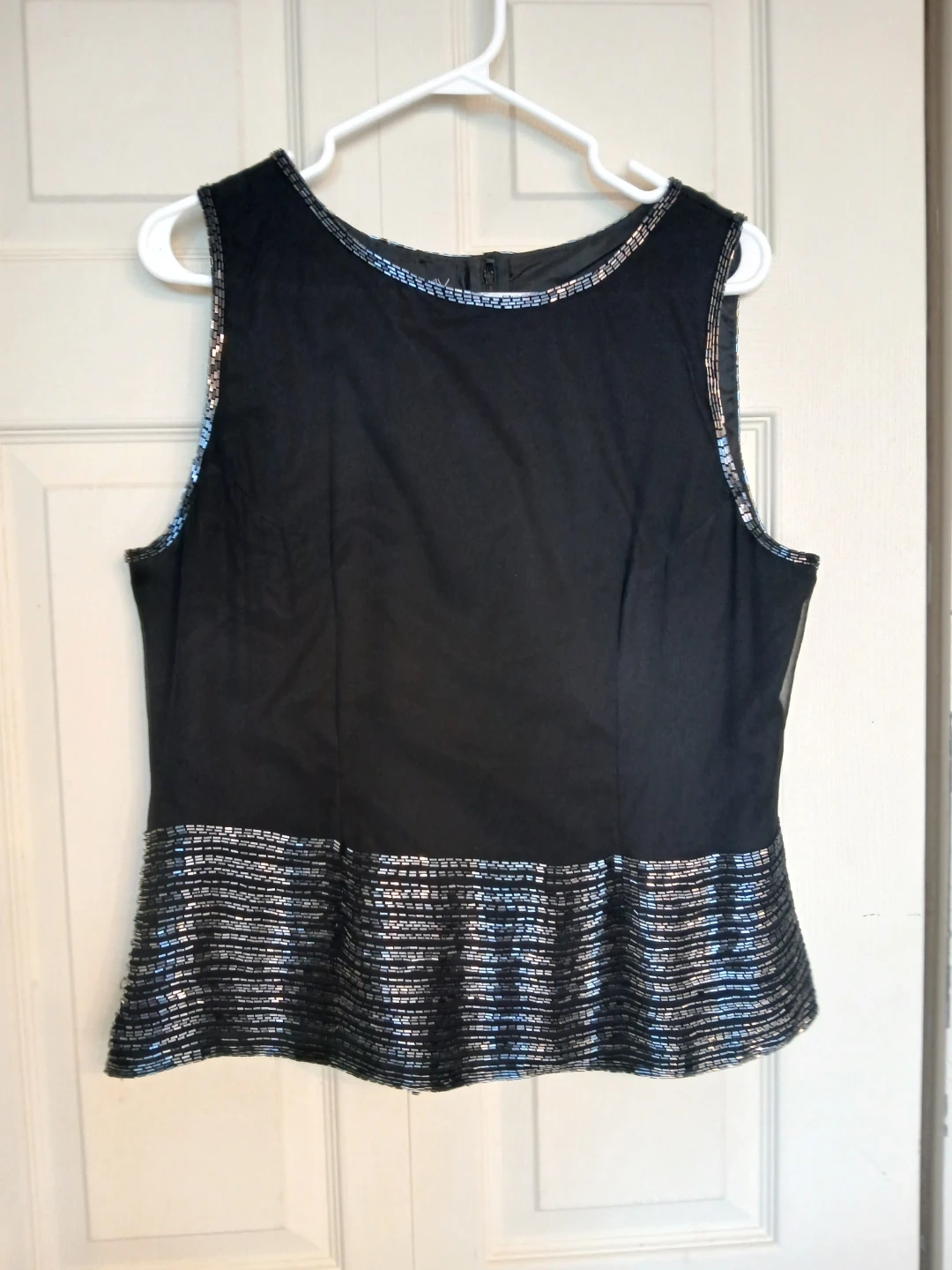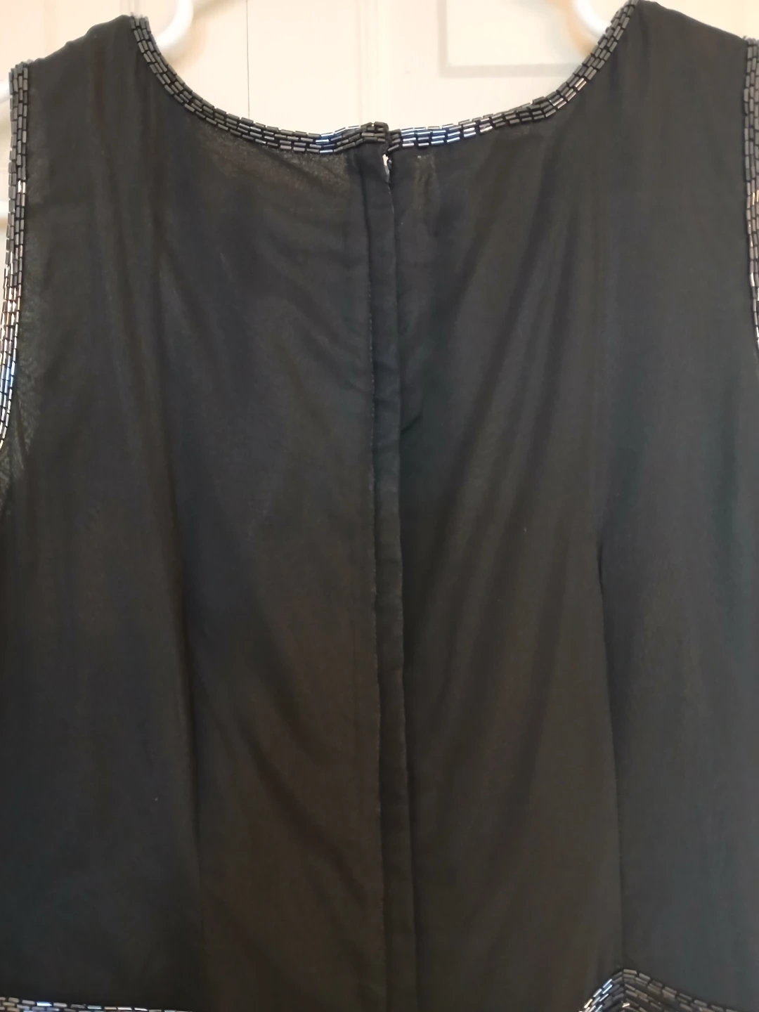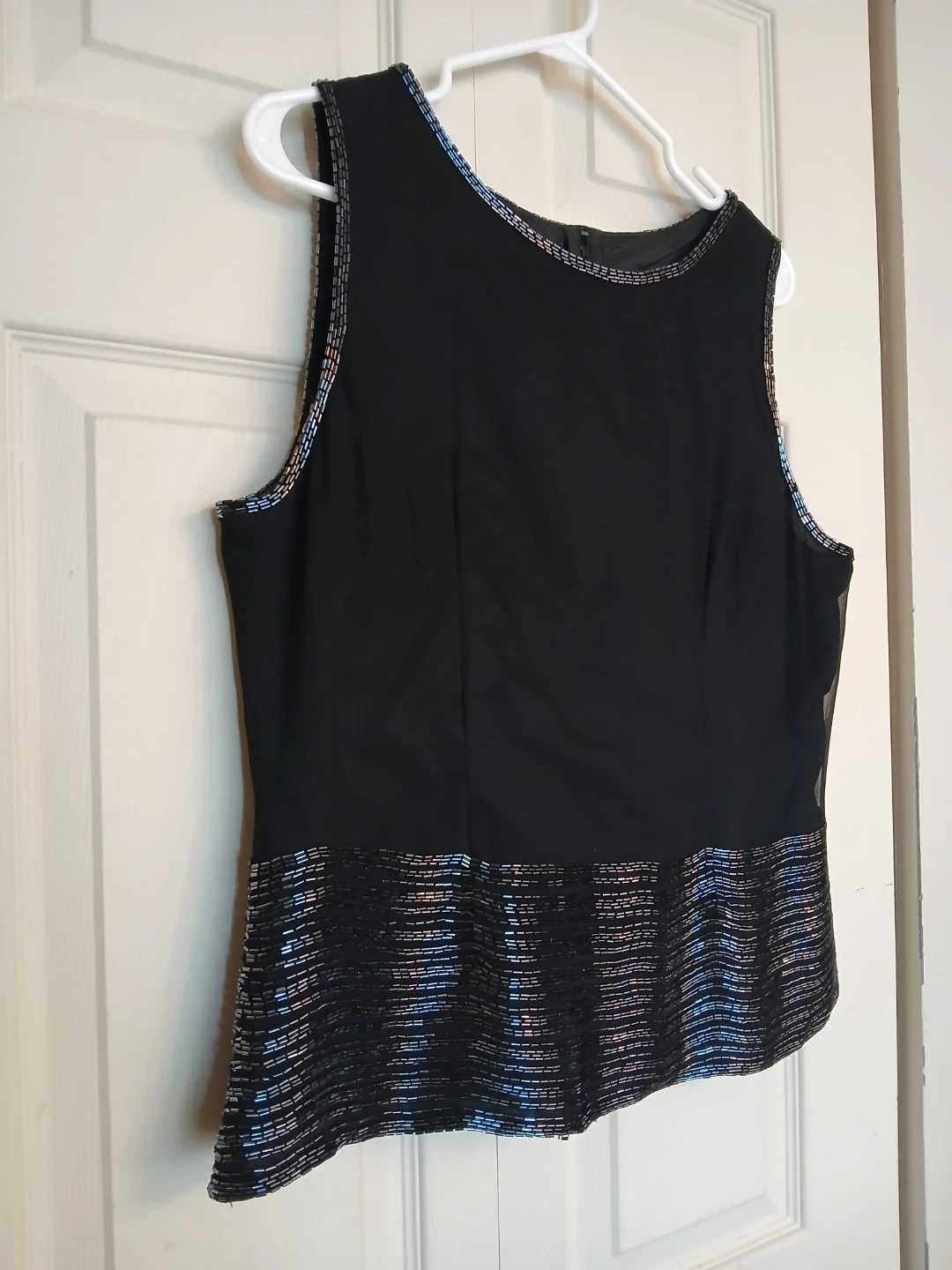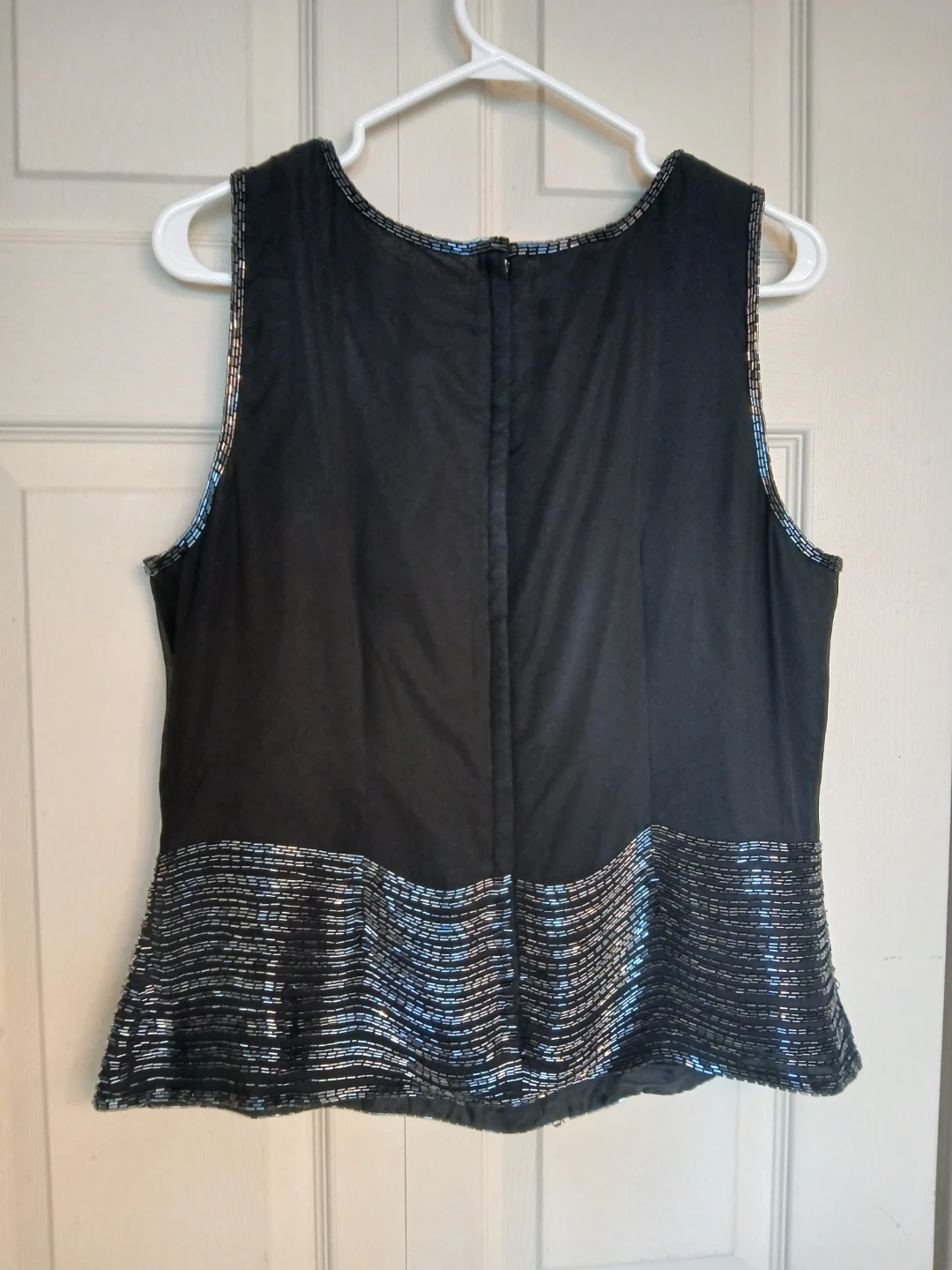 # woman women clothing clothes top blouse shirt sleeveless spring summer fall winter formal casual work office event black beads sequins size 12 large L extra large XL luxury designer name brand high end evening wear vintage 70s 80s glamorous beadwork