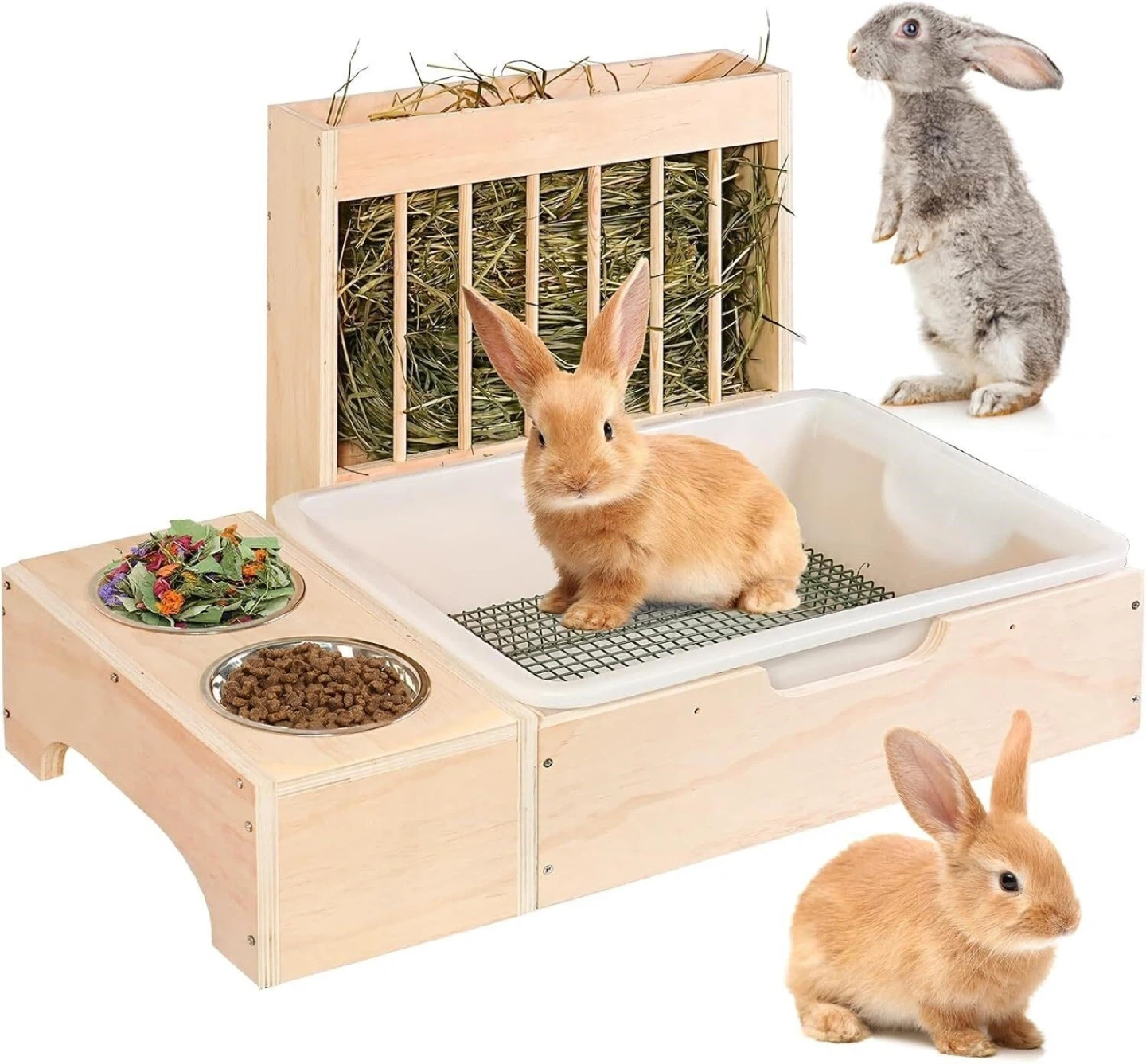 3 in 1 Extra Large Rabbit Hay Feeder with Litter Box, Wooden Bunny Toilet, for Large and Medium-Sized Dwarf Rabbit, Guinea Pig, Chinchillas, Hamster, Ferret, Other Animals
