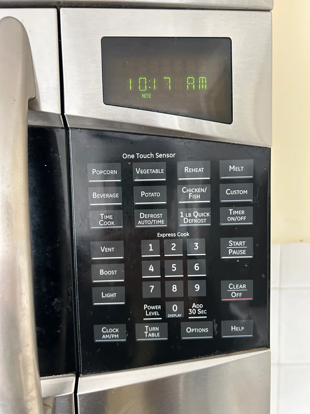 Stainless steel GE Profile over-the-range microwave. Features one-touch sensor cooking options like popcorn, reheat, and melt. Includes express cook, timer functions and vent.