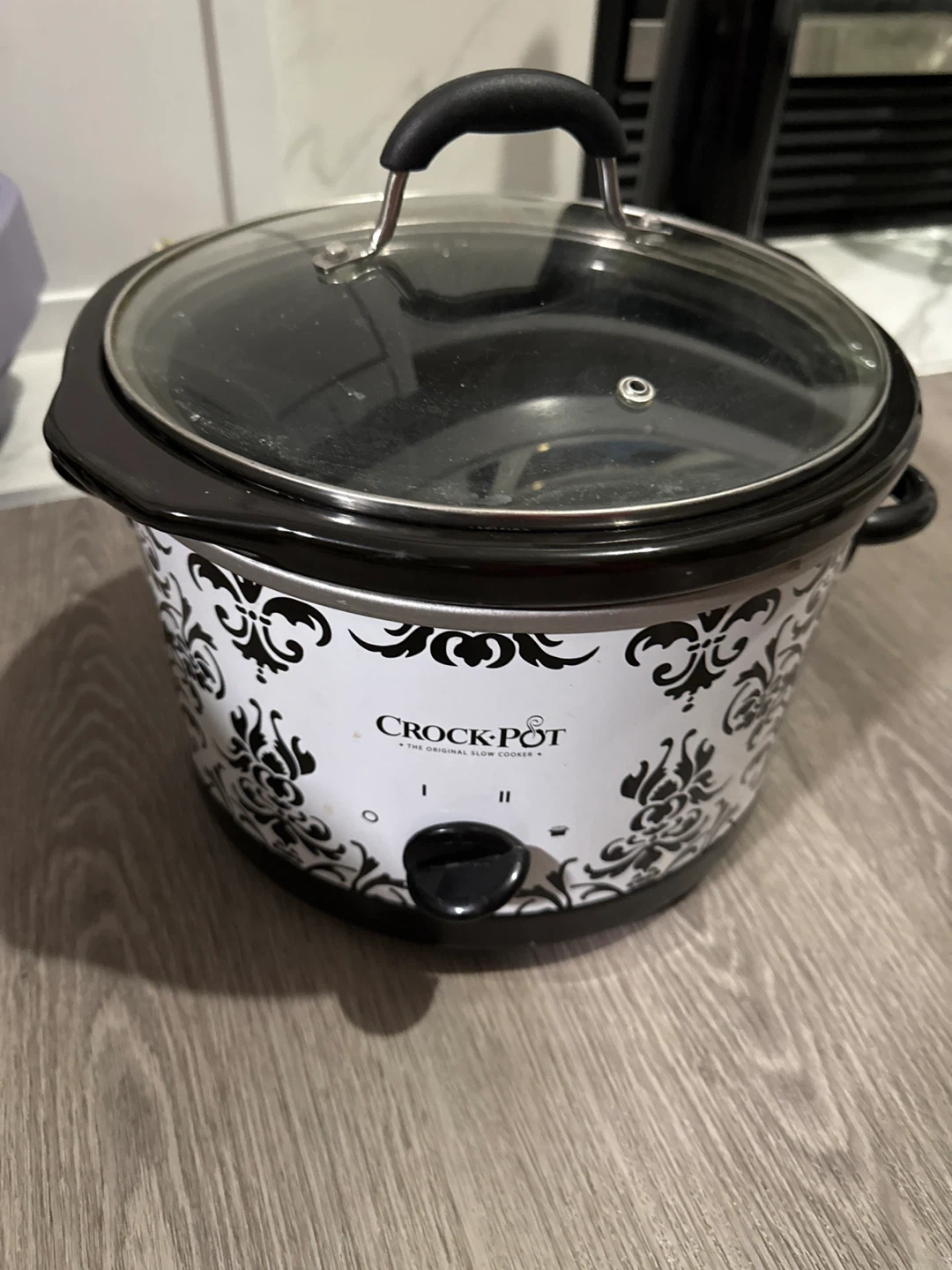 This Crock-Pot slow cooker has a decorative black and white exterior. It features a glass lid with a black handle. There are three settings: low, high, and off. It's great for making stews and roasts!