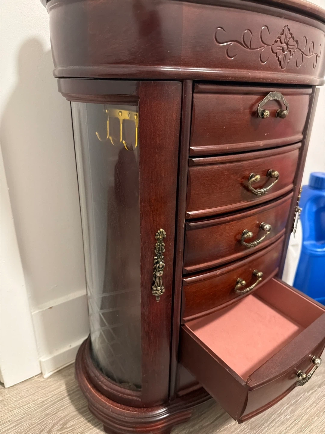 This is a wooden jewellery box with multiple drawers and side compartments for storage. It has ornate brass-toned hardware. Its compact size makes it perfect for a dresser or vanity.