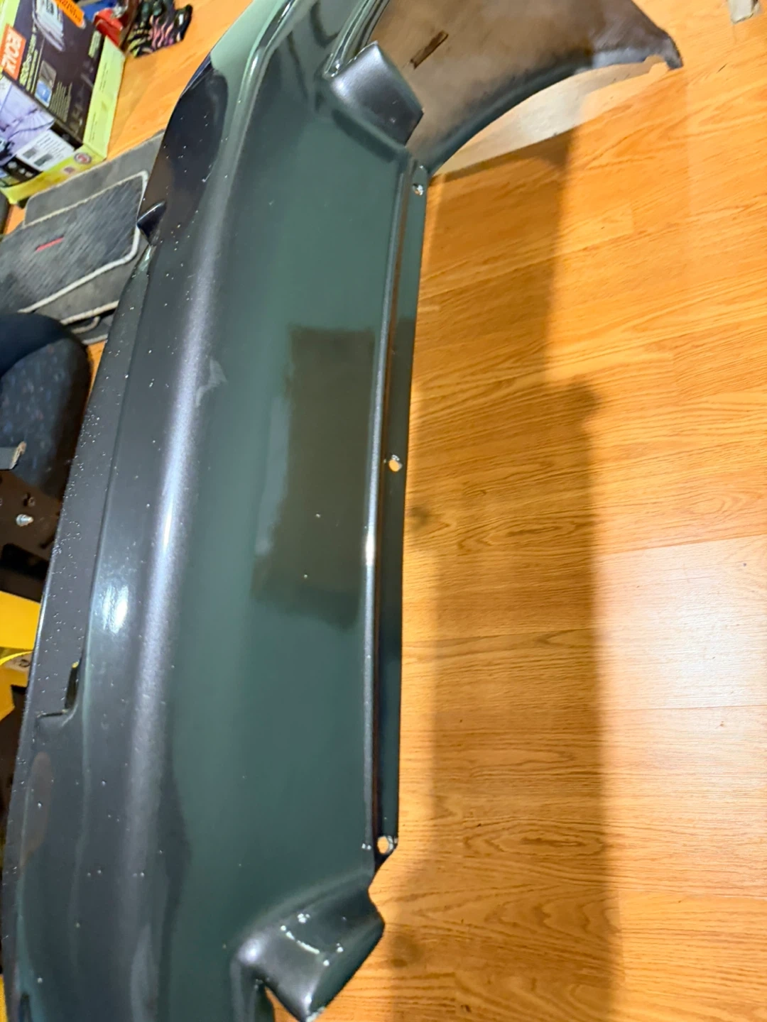 This is a dark gray front bumper. It has a glossy finish. This bumper is designed with multiple openings for lights and ventilation.