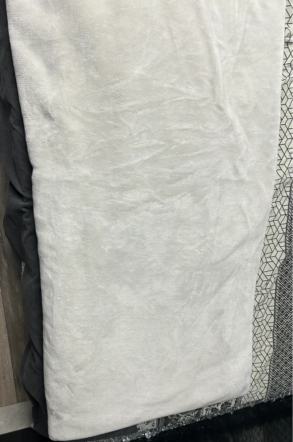 A cozy, light grey fleece blanket. It's made from soft material and feels plush to the touch. It's generously sized for extra comfort.It is full size mean king size bed’s blanket.