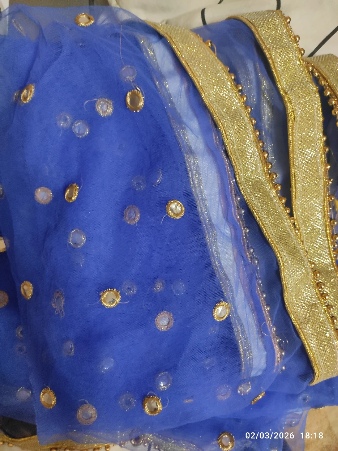Pink Anarkali suit with gold embroidery. It comes with a sheer blue dupatta with gold embellishments. The suit's fabric appears to be silk-blend, and the dupatta is net material. Perfect for festive occasions!