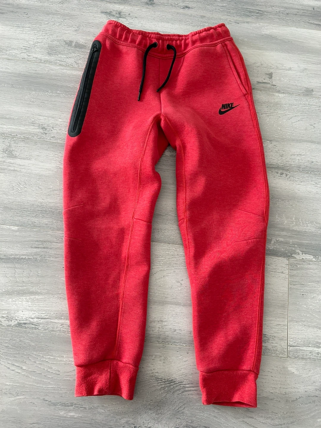 These are Nike Tech Fleece joggers in red. They're a size medium for kids and are made from a soft, comfortable fabric. Features a zippered pocket on the left leg.