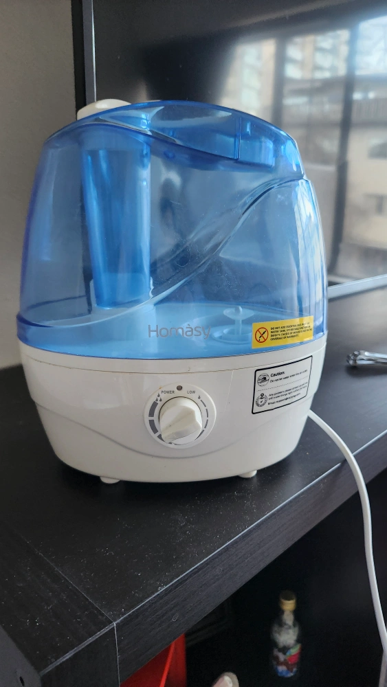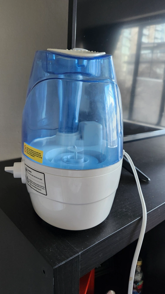Cool mist humidifier with a blue top and white base. It has a power switch and a dial to control the mist output.