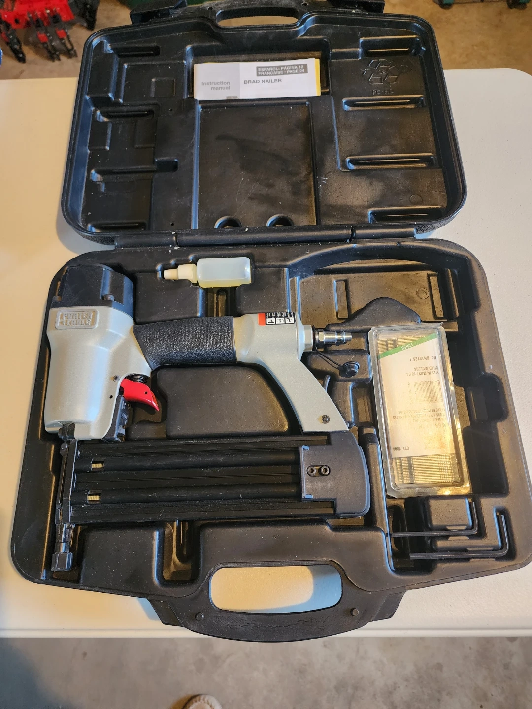 Selling a Porter-Cable Brad Nailer. It comes with its original case and an instruction manual. It also includes a box of nails. Great for various projects!