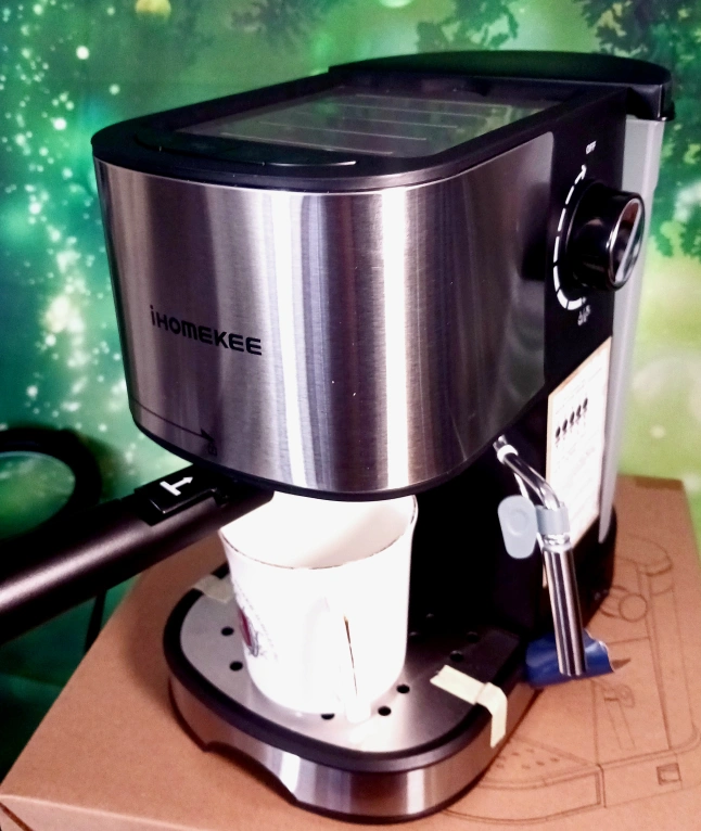 20 Bar White espresso machine with a pressure gauge and a steam wand. It has a single cup holder and drip tray. It also includes a portafilter.
