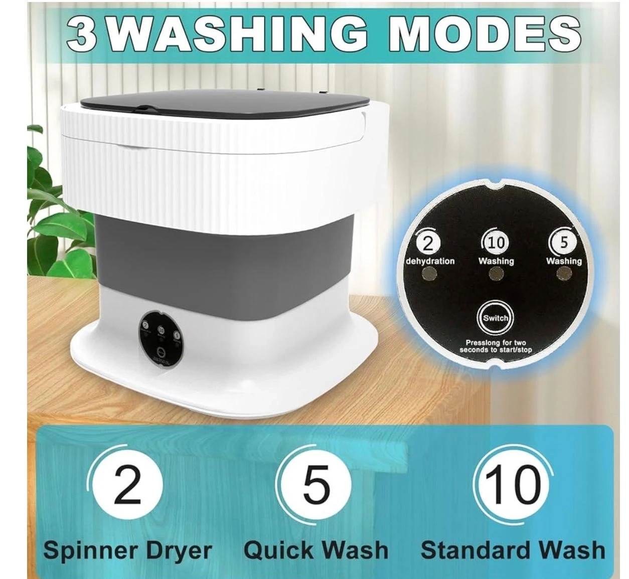 This is a portable, foldable washing machine with a 16L capacity. It offers three washing modes: 2-minute spinner dryer, 5-minute quick wash, and 10-minute standard wash. Great for small loads of laundry like t-shirts, socks, baby clothes, towels, and underwear. Its compact size makes it convenient for travel or small living spaces.