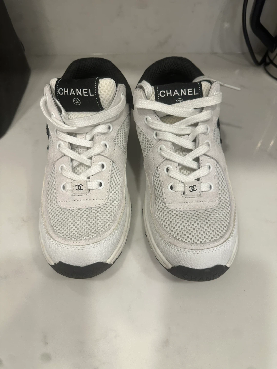 These are white Chanel sneakers. They're made with a mix of leather and mesh materials. The insoles show the Chanel logo.