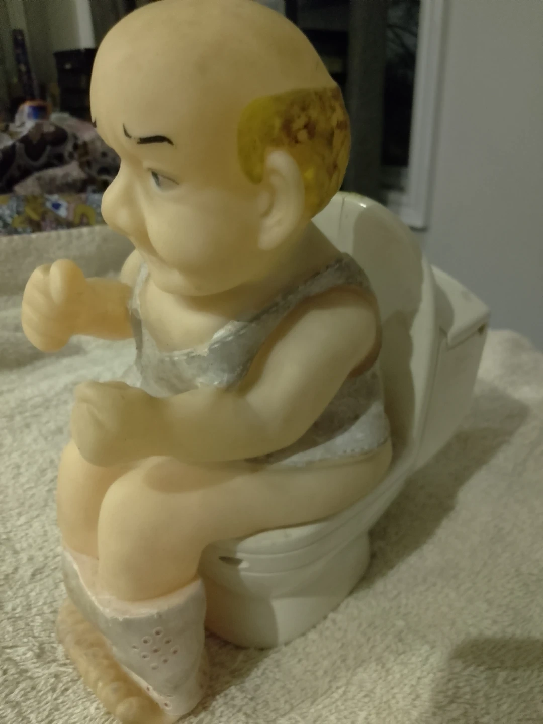 This figurine features a young man sitting on a toilet. It's made of a rubber and plastic material. Kinda dusty look. The item is like 2 decades old or more. It used to make noises while battery was inserted but that option is no more available. It can still be a decor in a toilet.