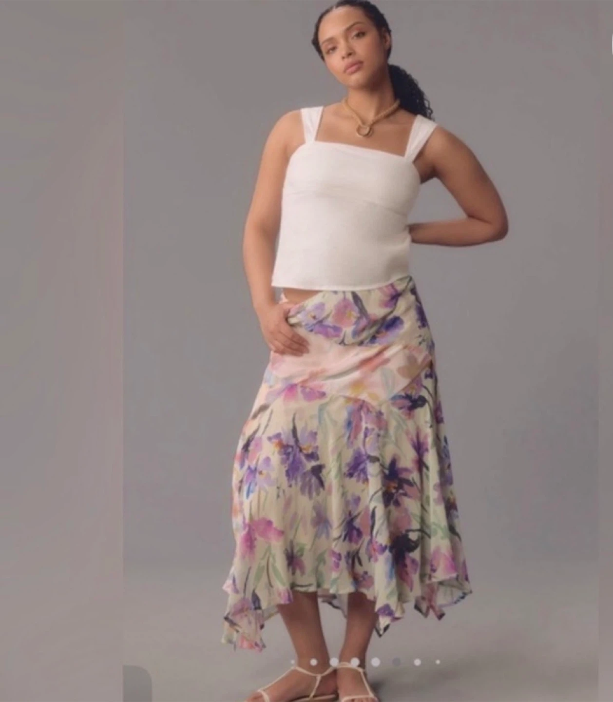 This flowing midi skirt showcases a vibrant watercolour floral print.