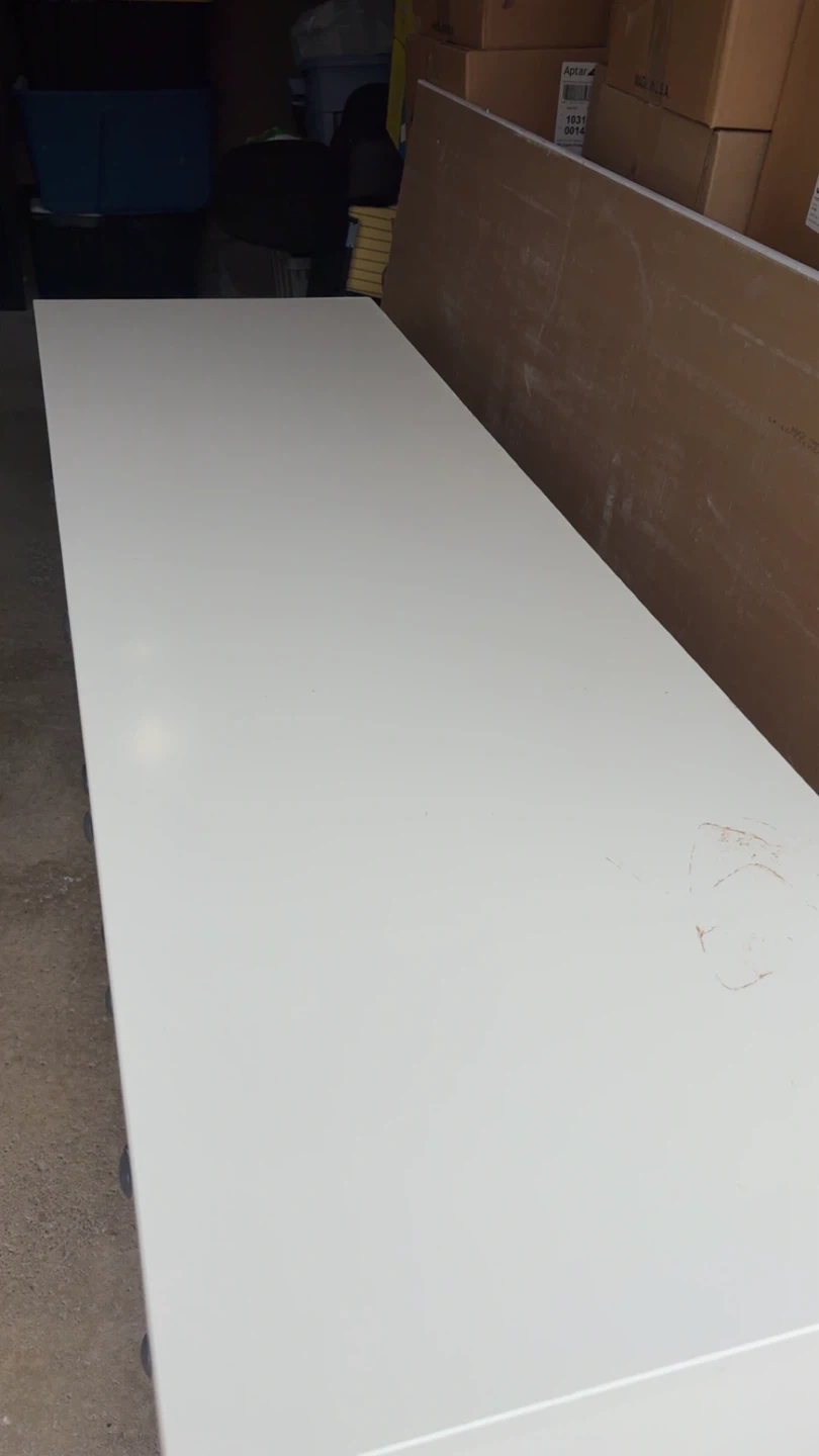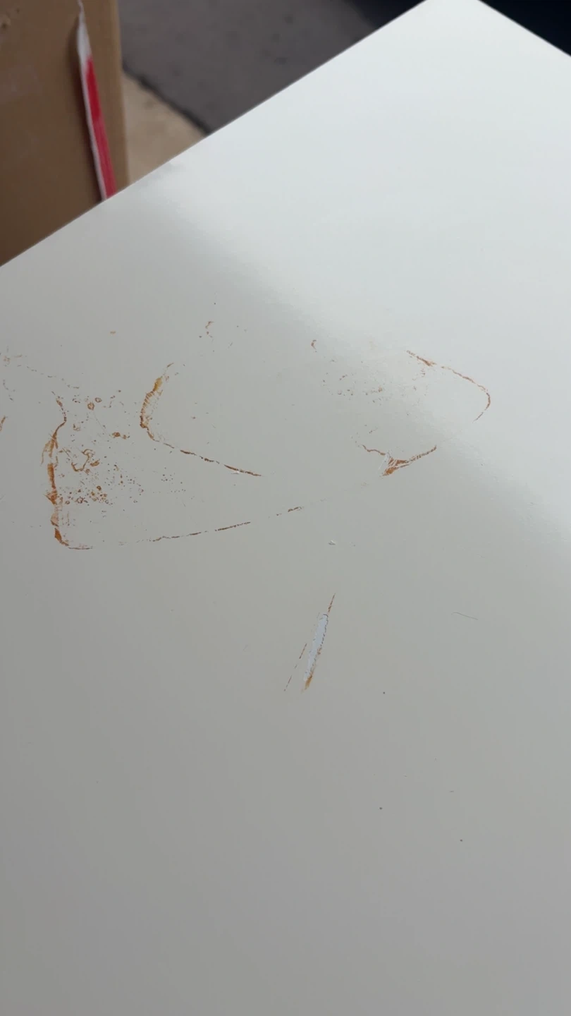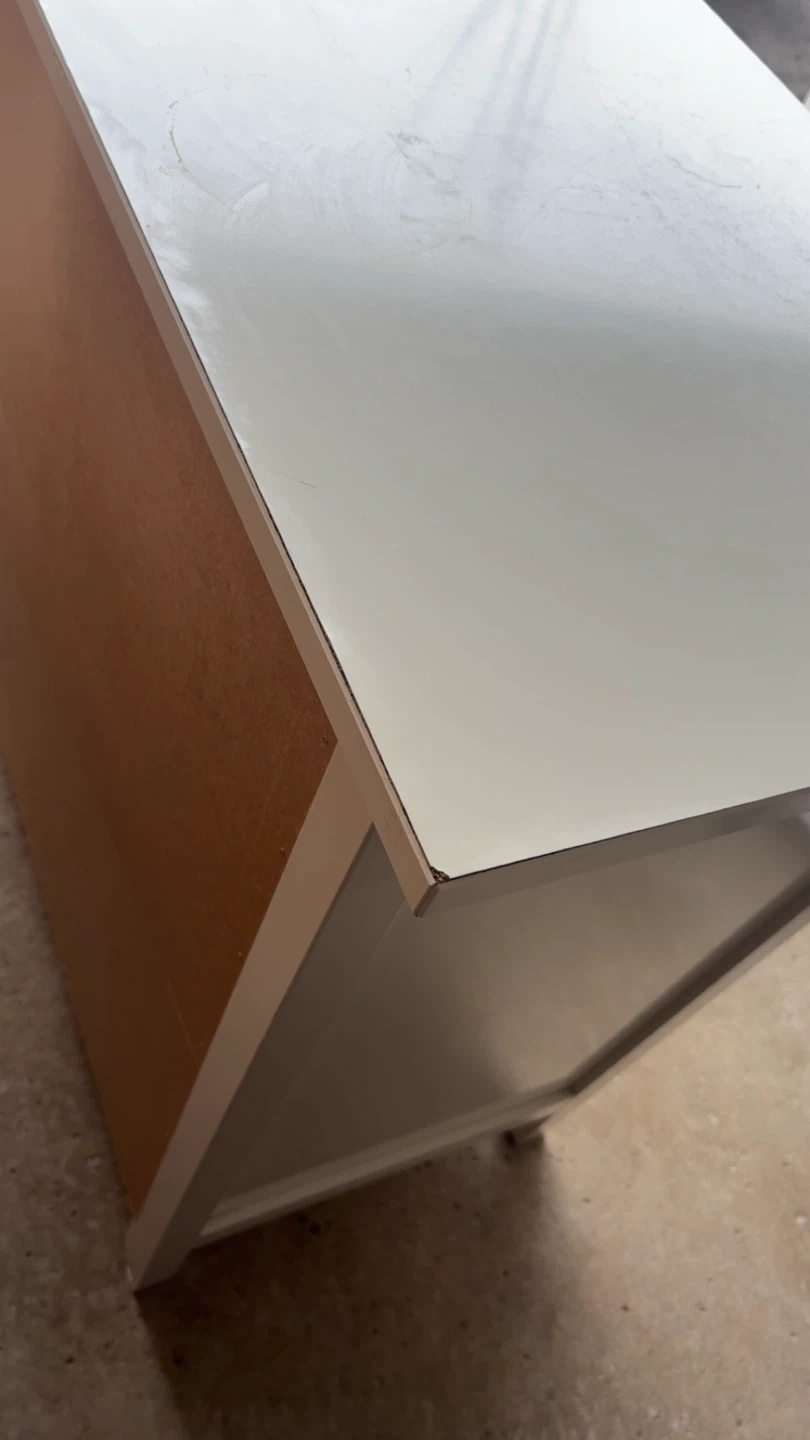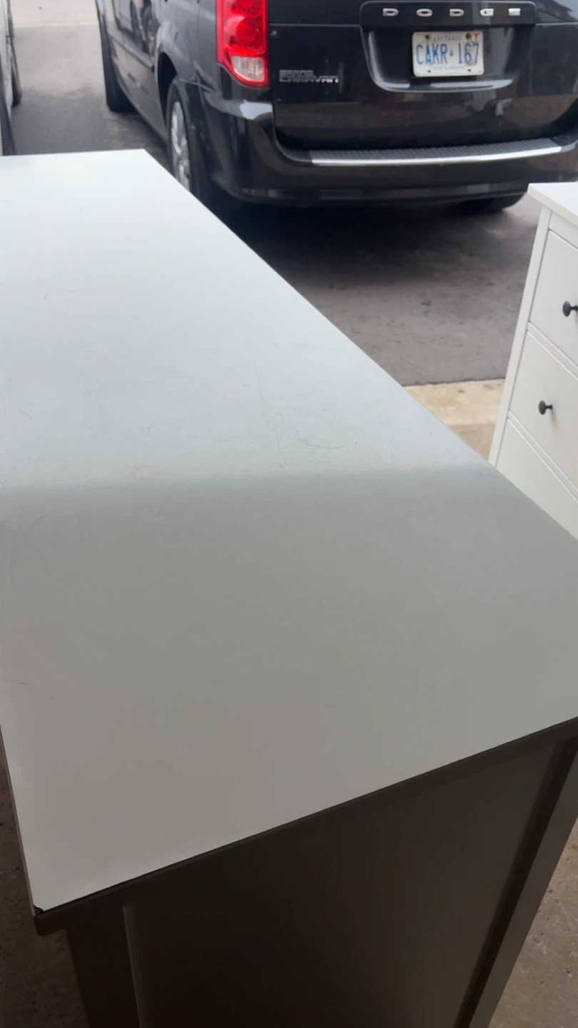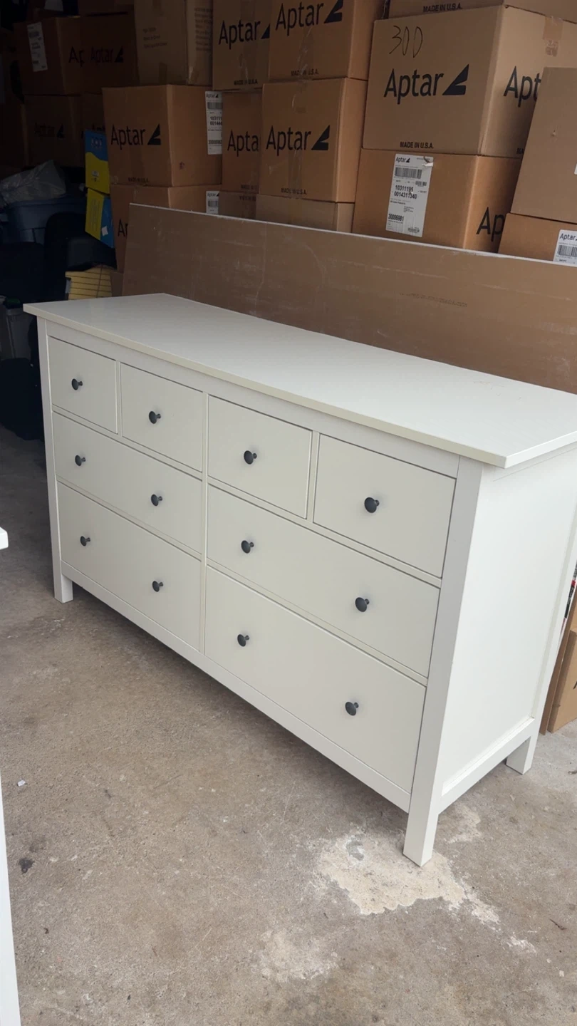 This is a white dresser with nine drawers. It's made of a wood composite material with black drawer knobs. It's a sturdy piece for bedroom storage. Has a stain but will come off with dawn power soap and magic eraser.
