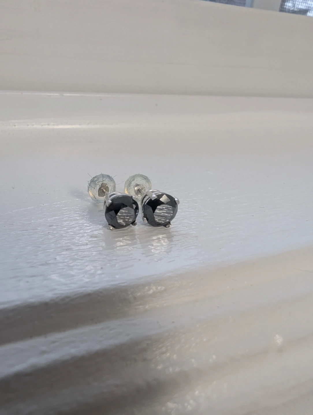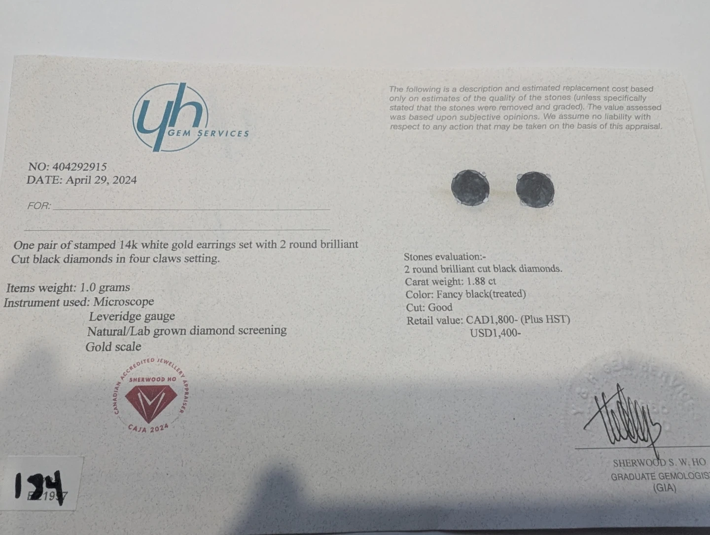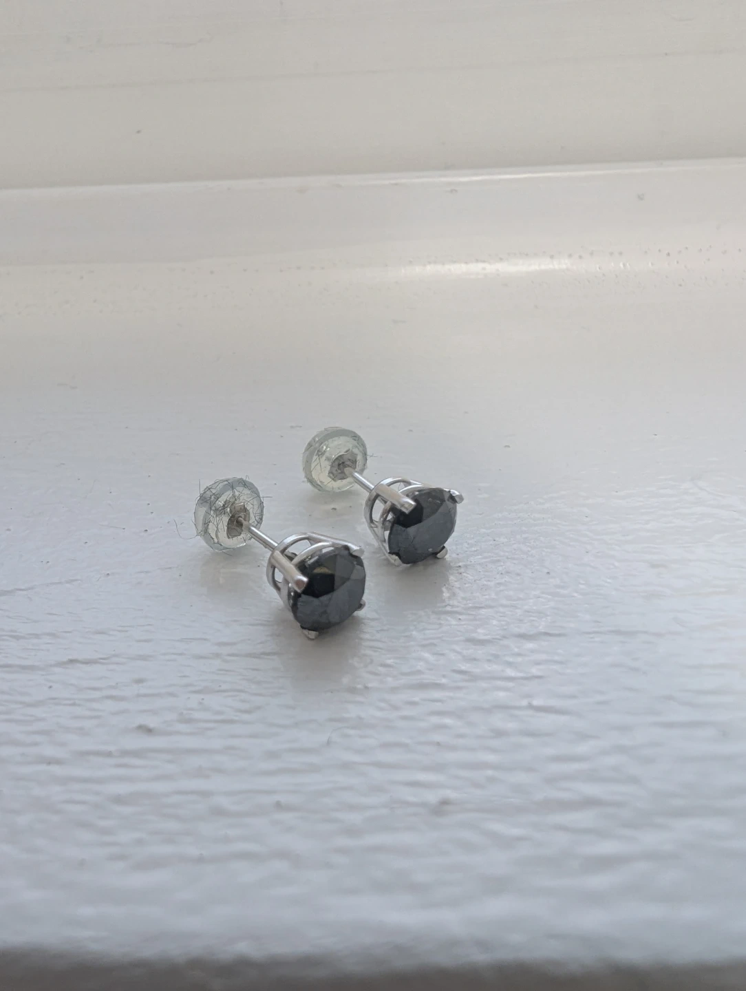 Brand new 14kt white gold two round brilliant cut treated black diamond earrings for sale. Stud earrings, gem stone, 2 round brilliant cut fancy black diamonds, 1.88ct carat. Retail value $1800 plus HST, selling for $600 FIRM. Comes with appraisal.