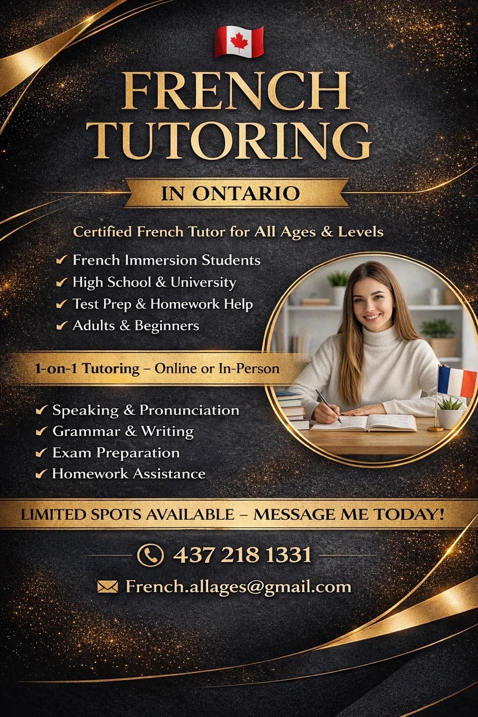 Get certified French tutoring for all ages and levels, including immersion students, high school, university, and beginners. Learn speaking, pronunciation, grammar, writing, and test prep. Tutoring is available online or in-person with limited spots!