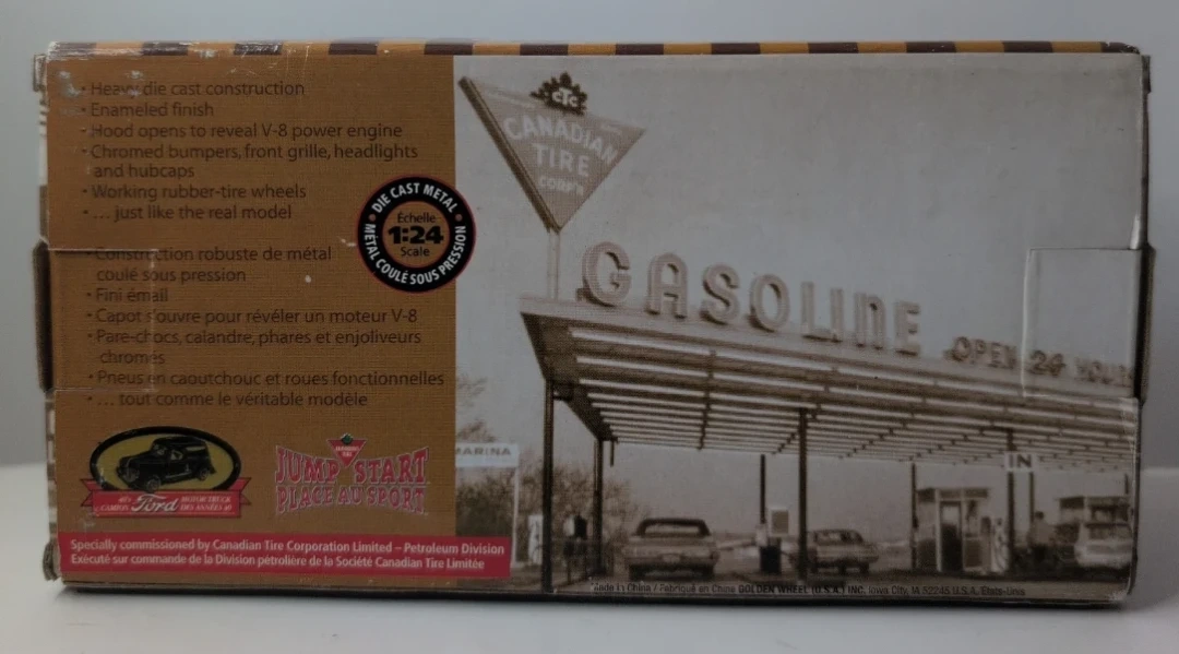This is a die cast metal collector's series 1940s Ford motor truck. It's a red enamel finish with "Canadian Tire" printed on the side. The truck features opening doors and hood, revealing a V-8 engine replica. It also has working rubber tires, and the front doors, hood, and hubcaps are chrome.