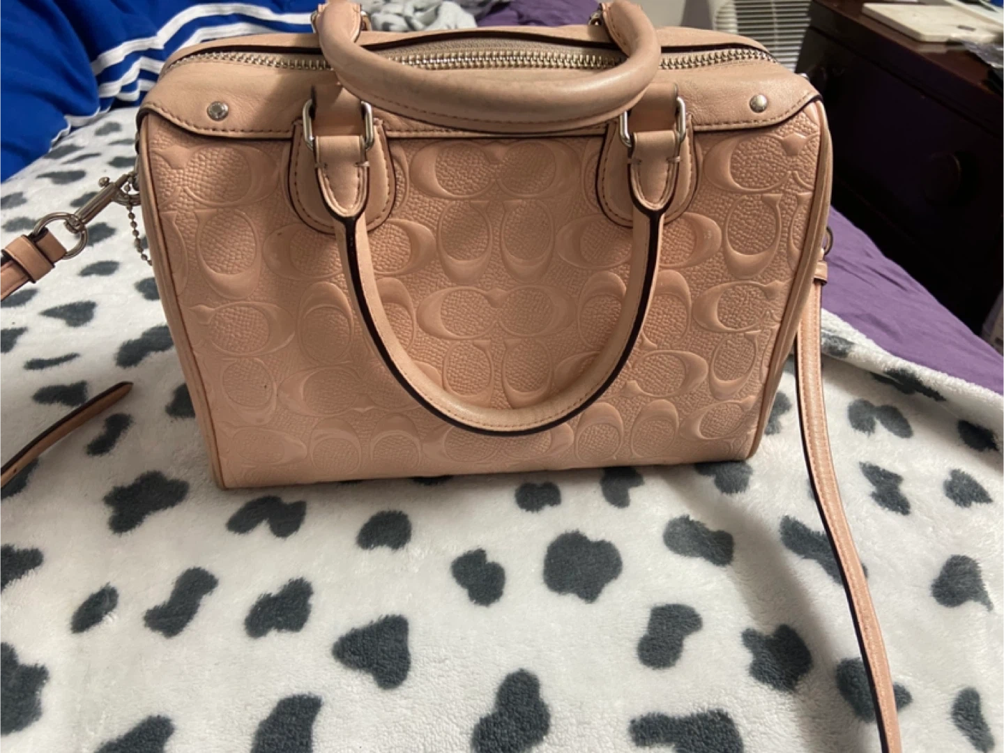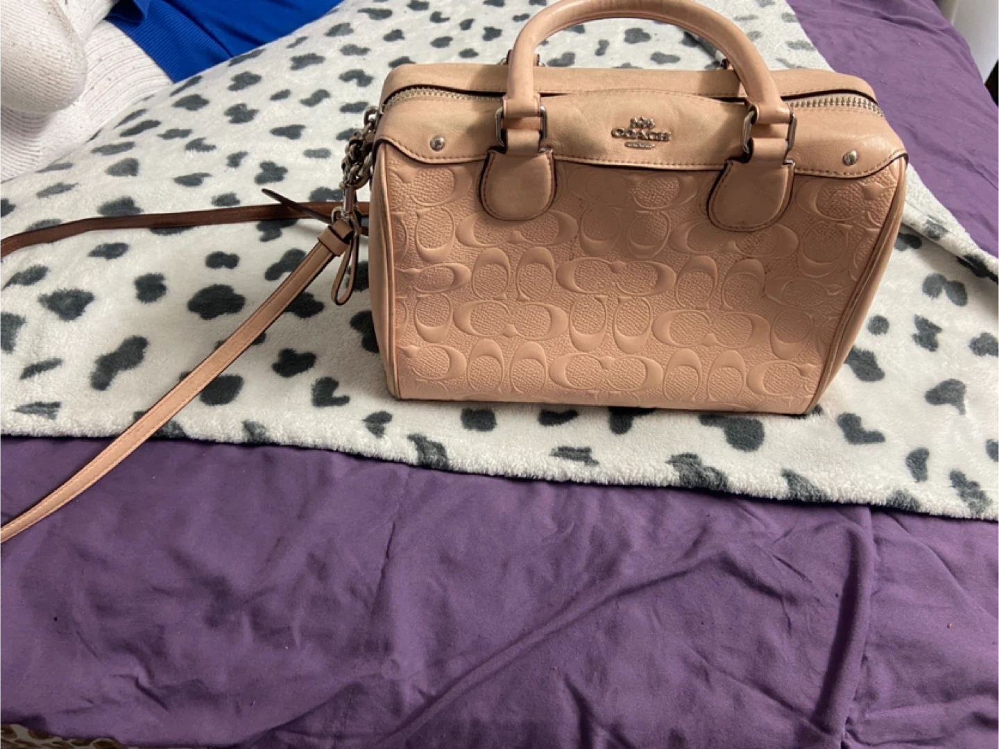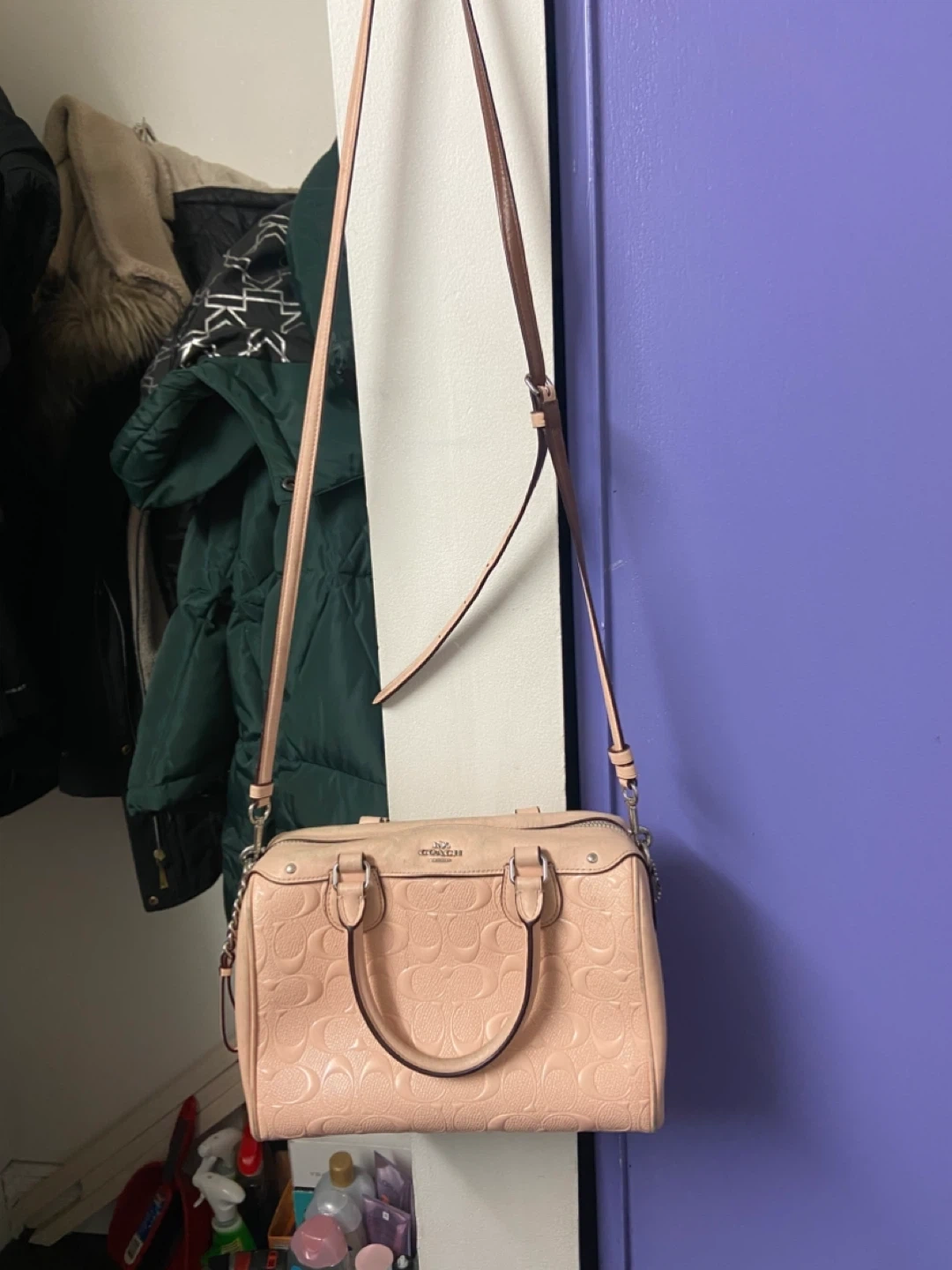 This Coach satchel is made of embossed leather in a lovely pink shade. It features dual top handles and an adjustable shoulder strap for versatility. It's a stylish addition to any outfit!