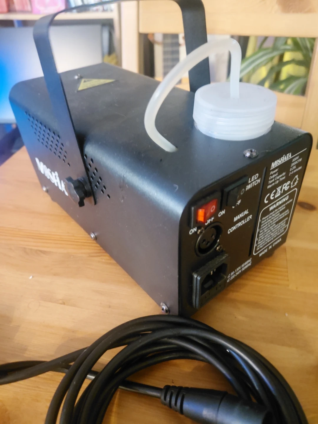 This is a black MOSFIATA smoke machine with a wired remote. It includes the power cord and wired remote. It's great for parties or events!