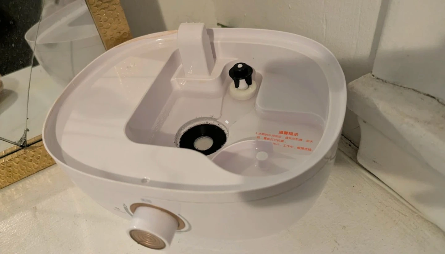 Bear brand humidifier. It has a white exterior with a golden accent on the top. Larger water tank so has to be refilled less-frequently. Adjustable dial to control mist volume. The plastic has yellowed slightly in spots just from sunlight shining through the window. Smoke-free, dog-friendly home. Pick-up in Belgravia