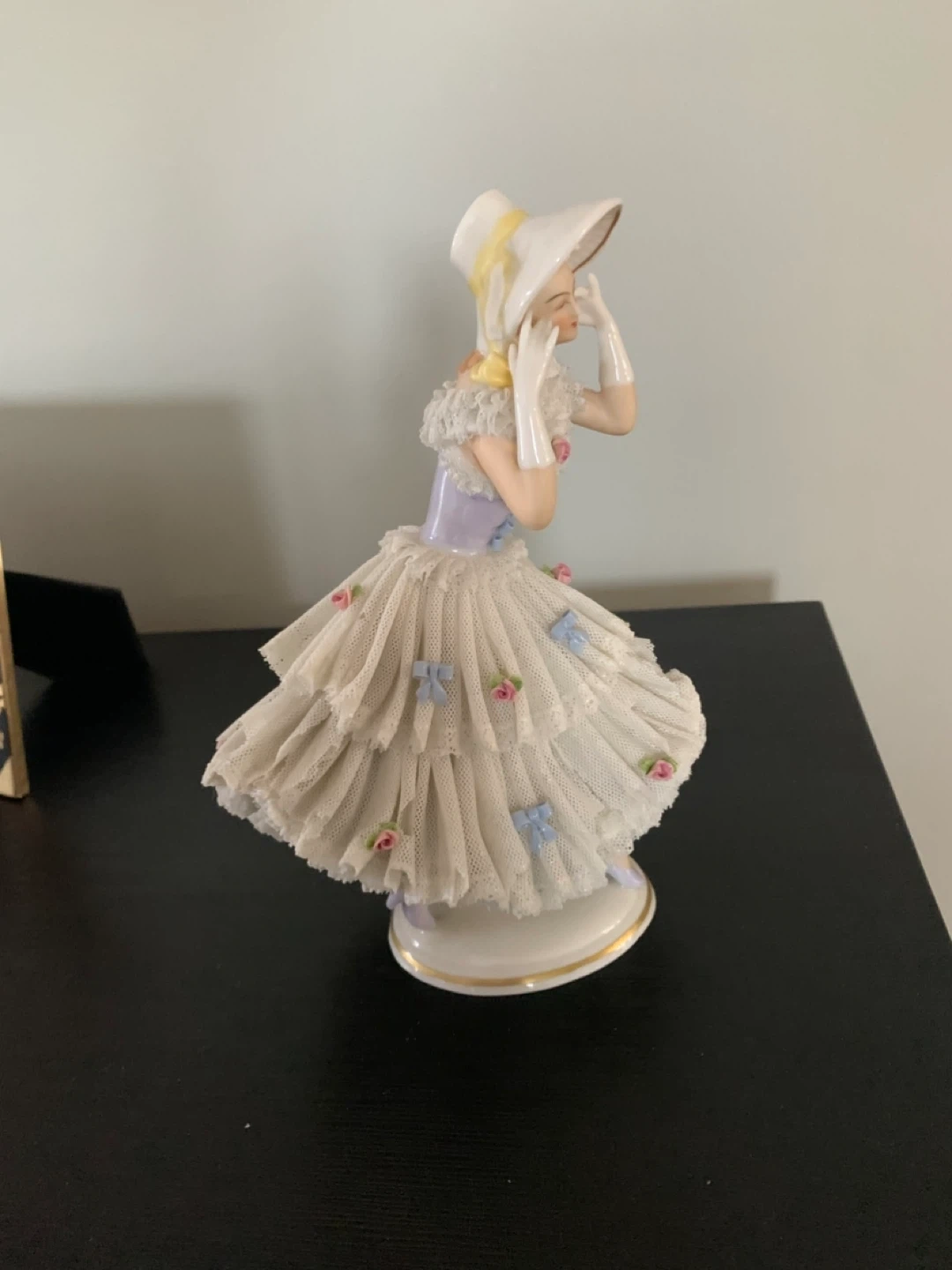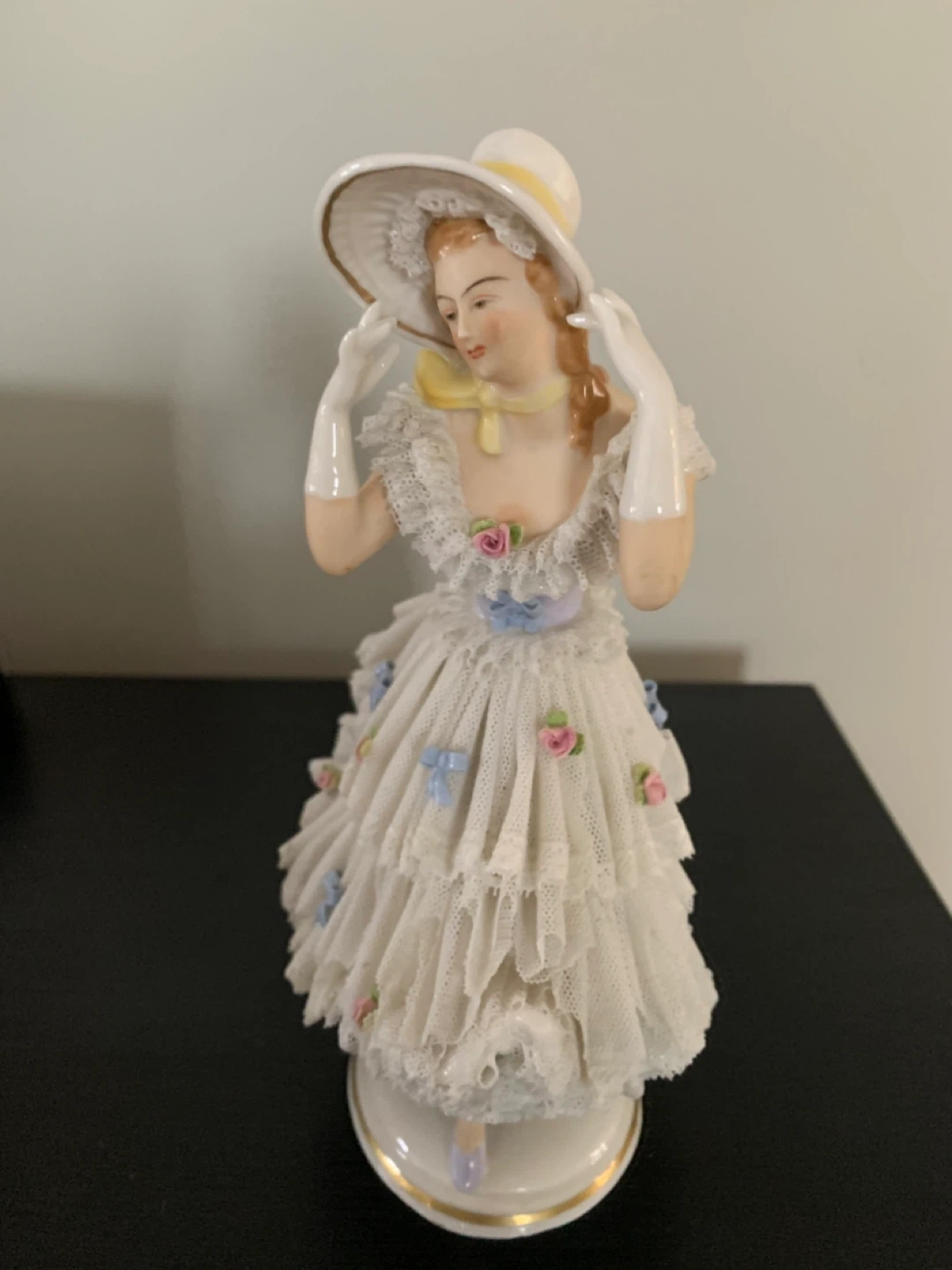 This is a beautiful vintage porcelain figurine of a lady wearing a hat and a lovely dress. It would make a great addition to any collection!