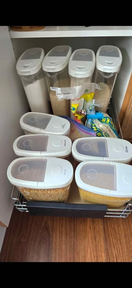 Adjustable Richelieu pull-out kitchen cabinet organizer. Chrome finish. Width adjusts from 12.5 in to 20.2 in, depth is 19.7 in. Requires assembly. Pickup only in Coquitlam.