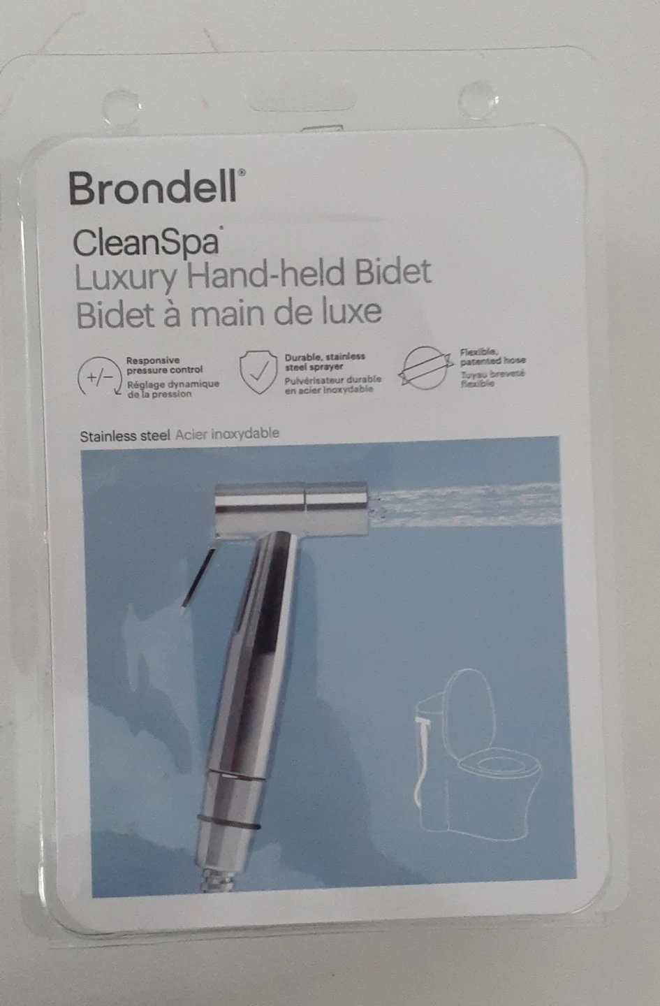 I am selling a new Brondell CleanSpa Luxury Hand-held Bidet. This bidet features responsive pressure control and a durable stainless steel sprayer. It offers a simple, DIY installation with all parts included for standard installation, including a valve with pressure control and a wall shutoff and mounted sprayer holster. The unit is also backed by a 1-year limited warranty.