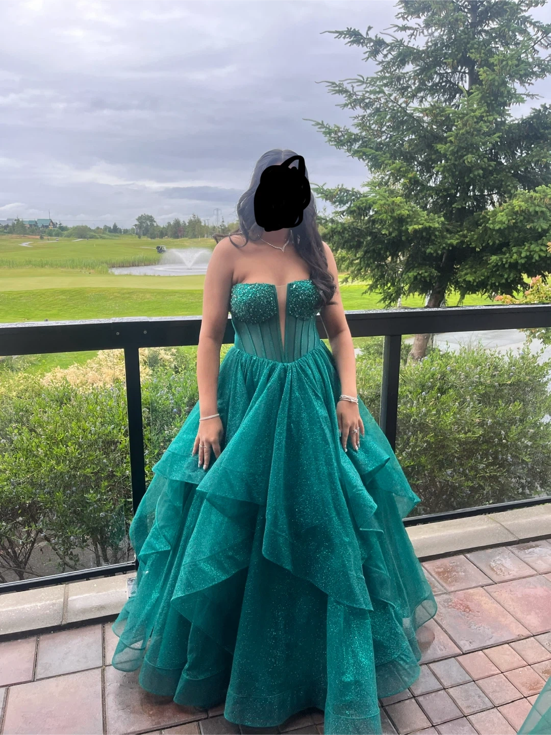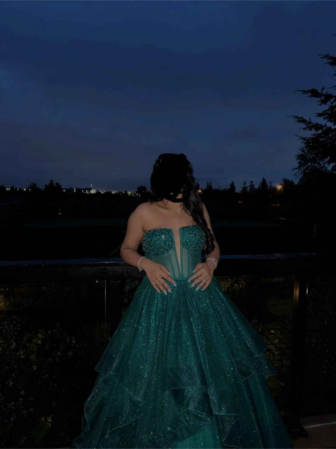 This stunning emerald green ball gown features a sparkly, layered tulle skirt and a fitted bodice adorned with shimmering beads. It's a strapless, floor-length design perfect for formal events.