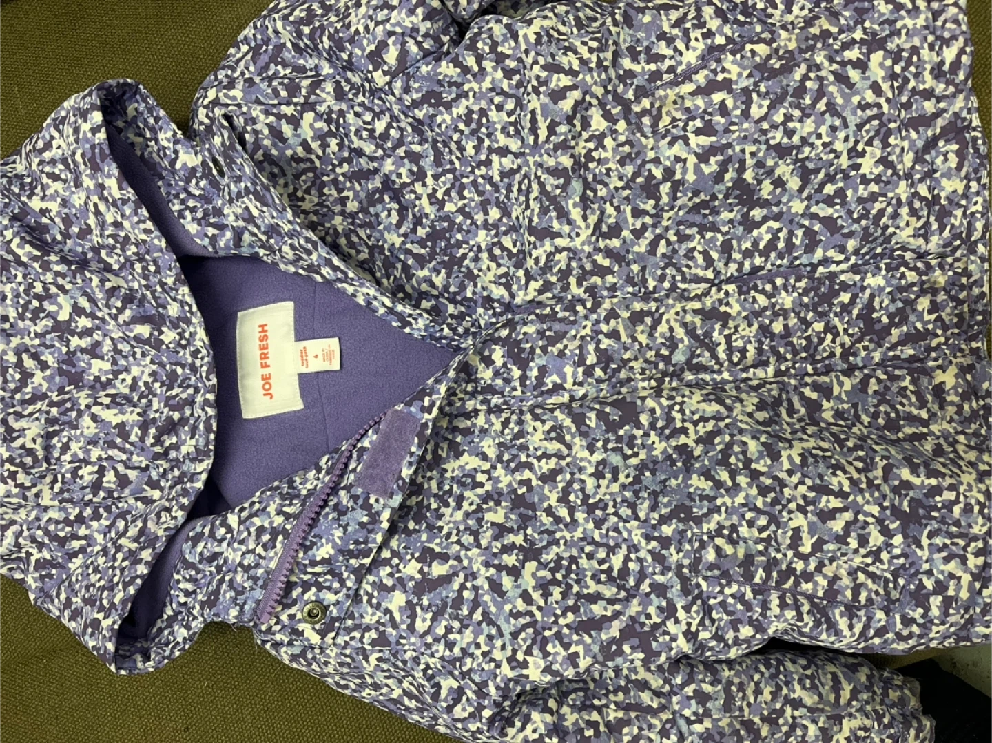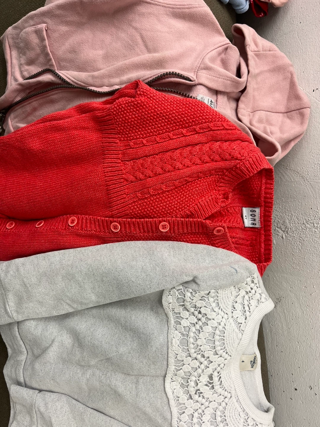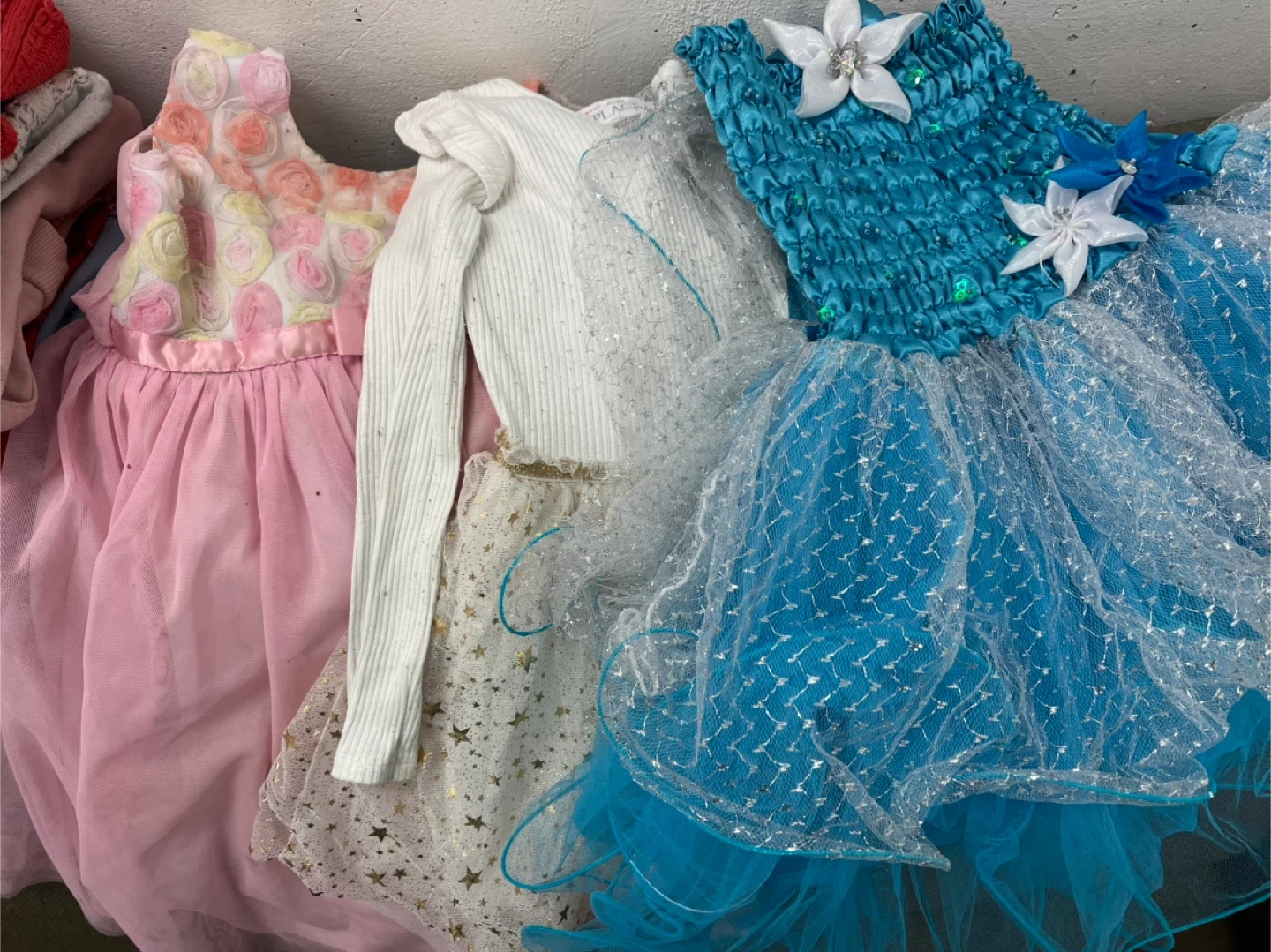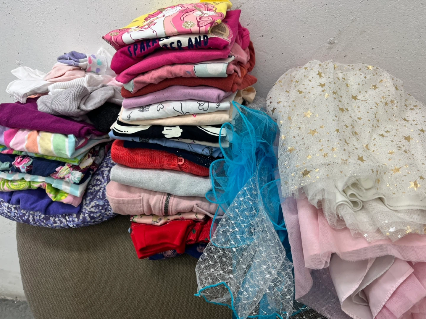 This is a bundle of girls' clothing including a Joe Fresh Primaloft winter jacket, sweaters, tops (long and short sleeved), dresses, pjs, stockings and socks. Items feature various colours and prints.