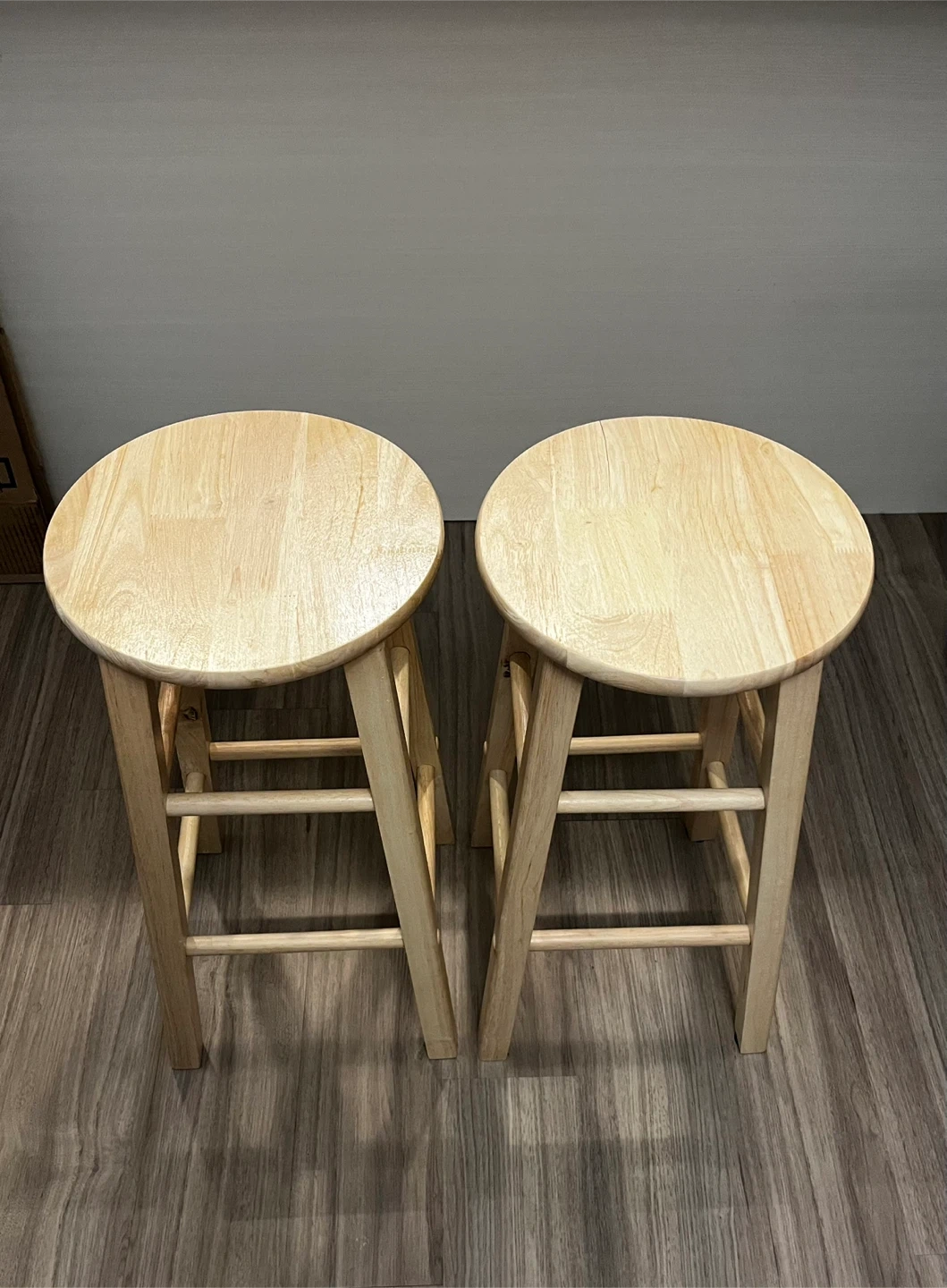 Two round top bar stools made of light-coloured wood. These stools feature a classic design with four legs and a supportive crossbar. They're sturdy and ready for your kitchen counter or bar area! $20 for both