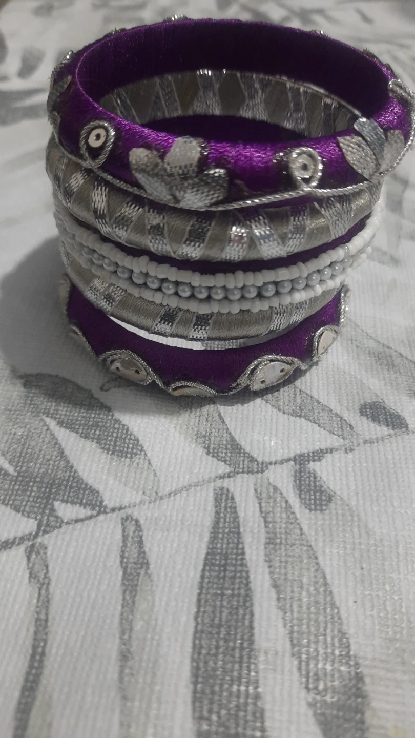 5.7 cm bangles size. Custom made. Each set 20 or all together 80 cad. 1 black and golden set, black thread and golden gillter stone( 5pc), 1 purple sliver thread small glitter stone set( 5pc), 1 set of black thread bangles (10pc), 1 set of silver thread bangles (10pc), 1 set of golden thread bangles(10pc)