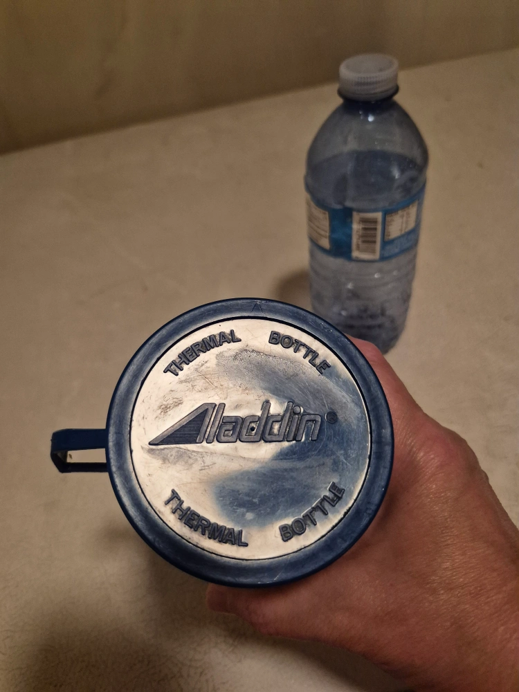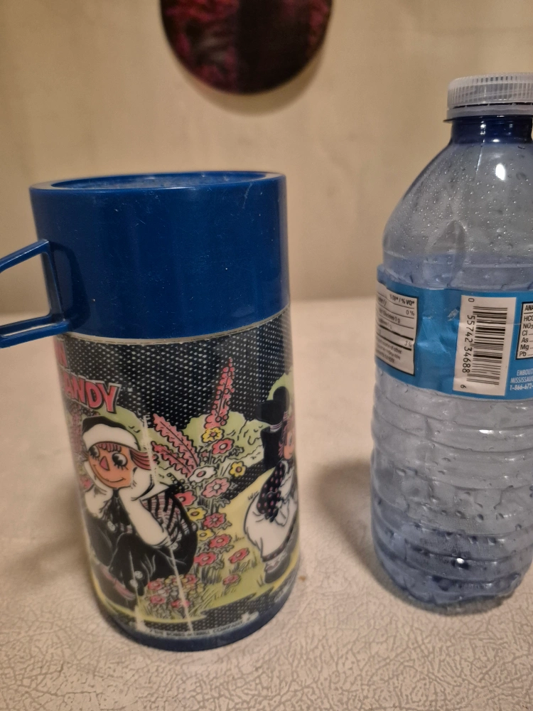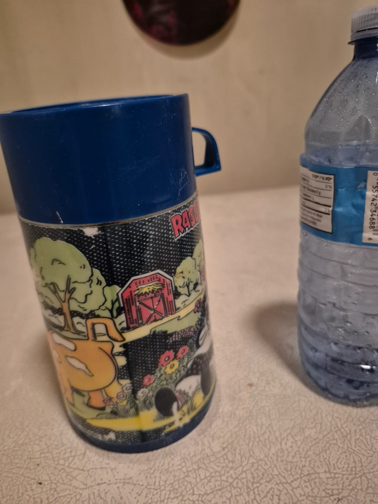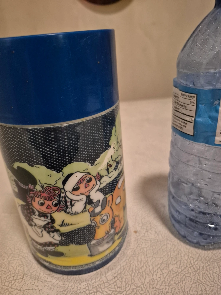Vintage Aladdin thermal bottle featuring Raggedy Ann and Andy characters! It's blue and in good condition. Perfect for keeping your drinks hot or cold on the go