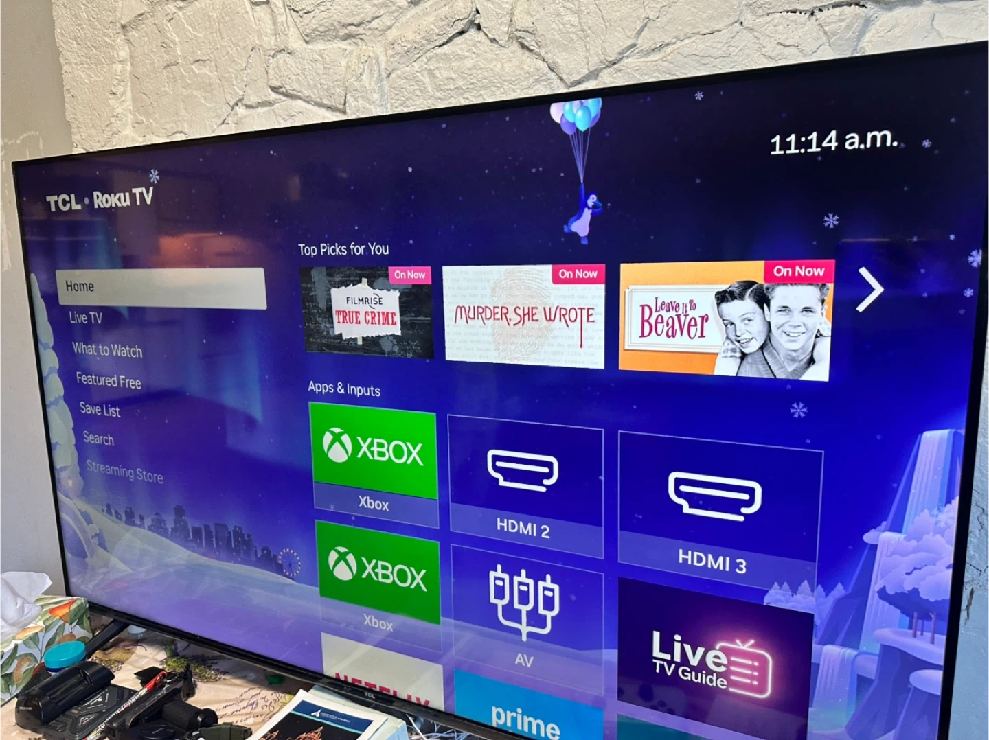 This TCL Roku TV is a smart television with built-in streaming capabilities. It offers multiple HDMI inputs for connecting external devices. The TV's interface provides access to live TV, streaming stores, and various apps. Used for almost 3 years. Everything perfectly working.