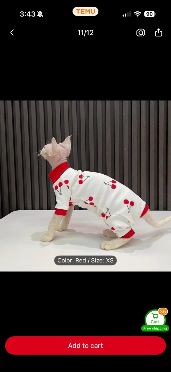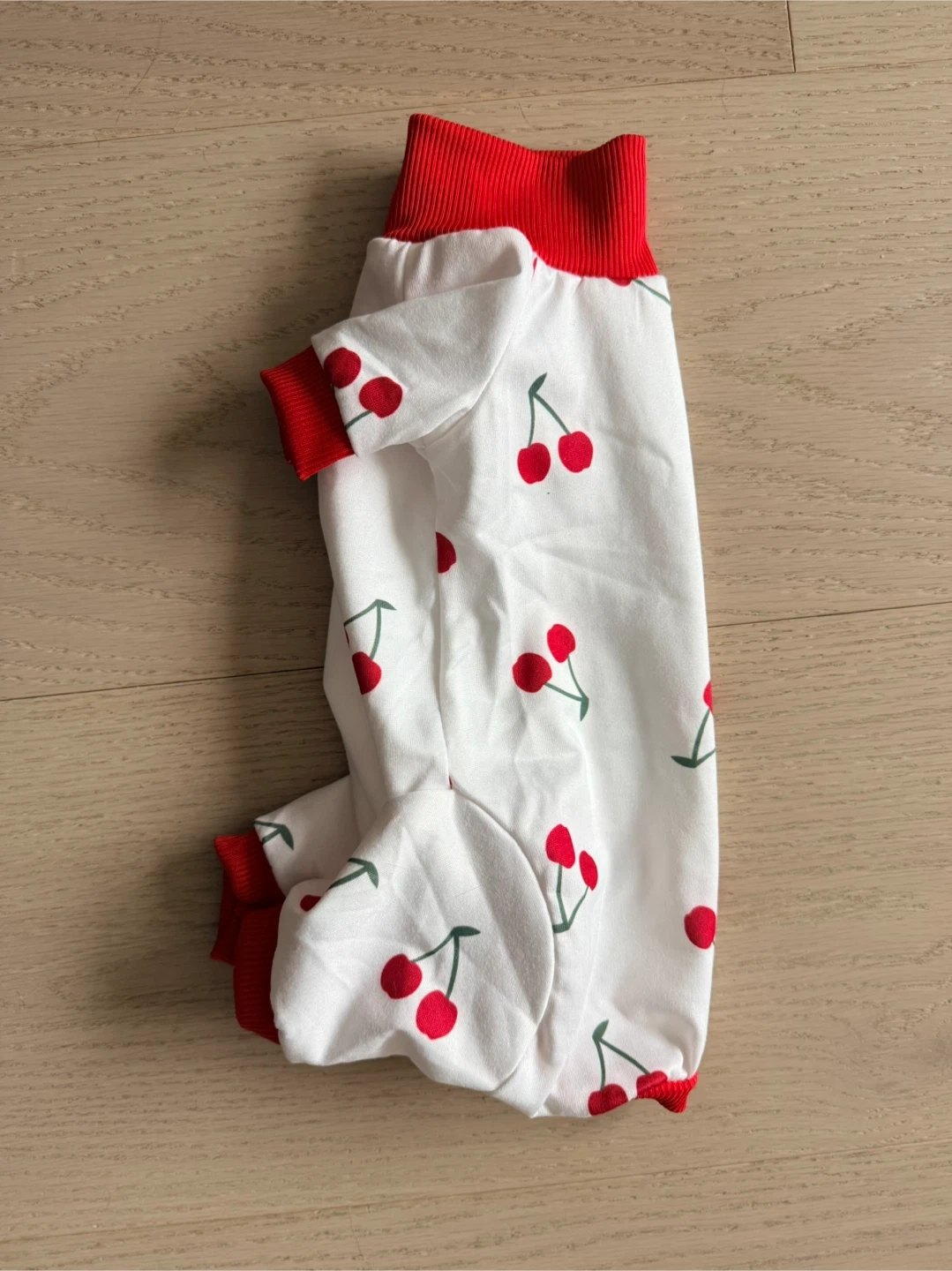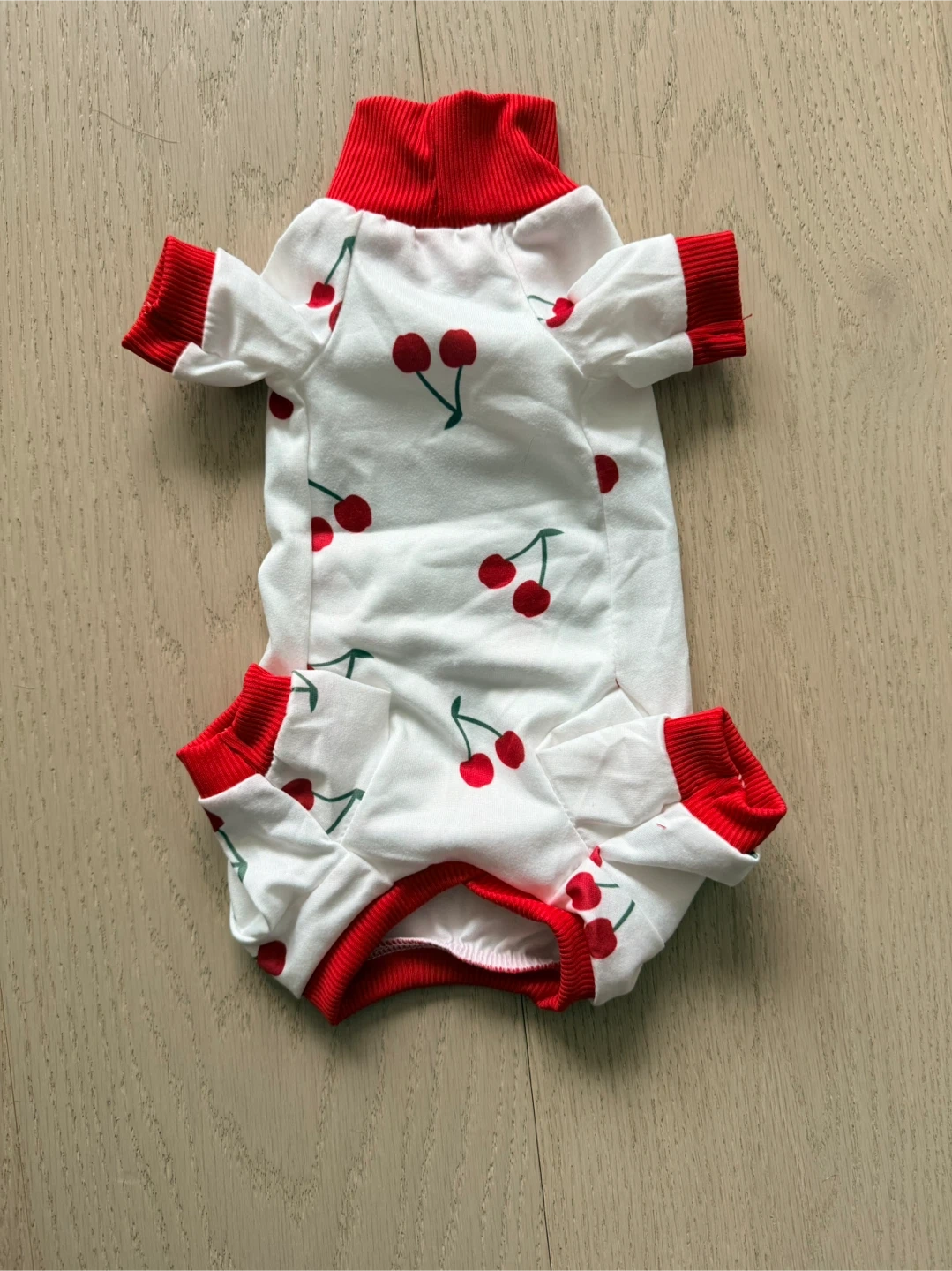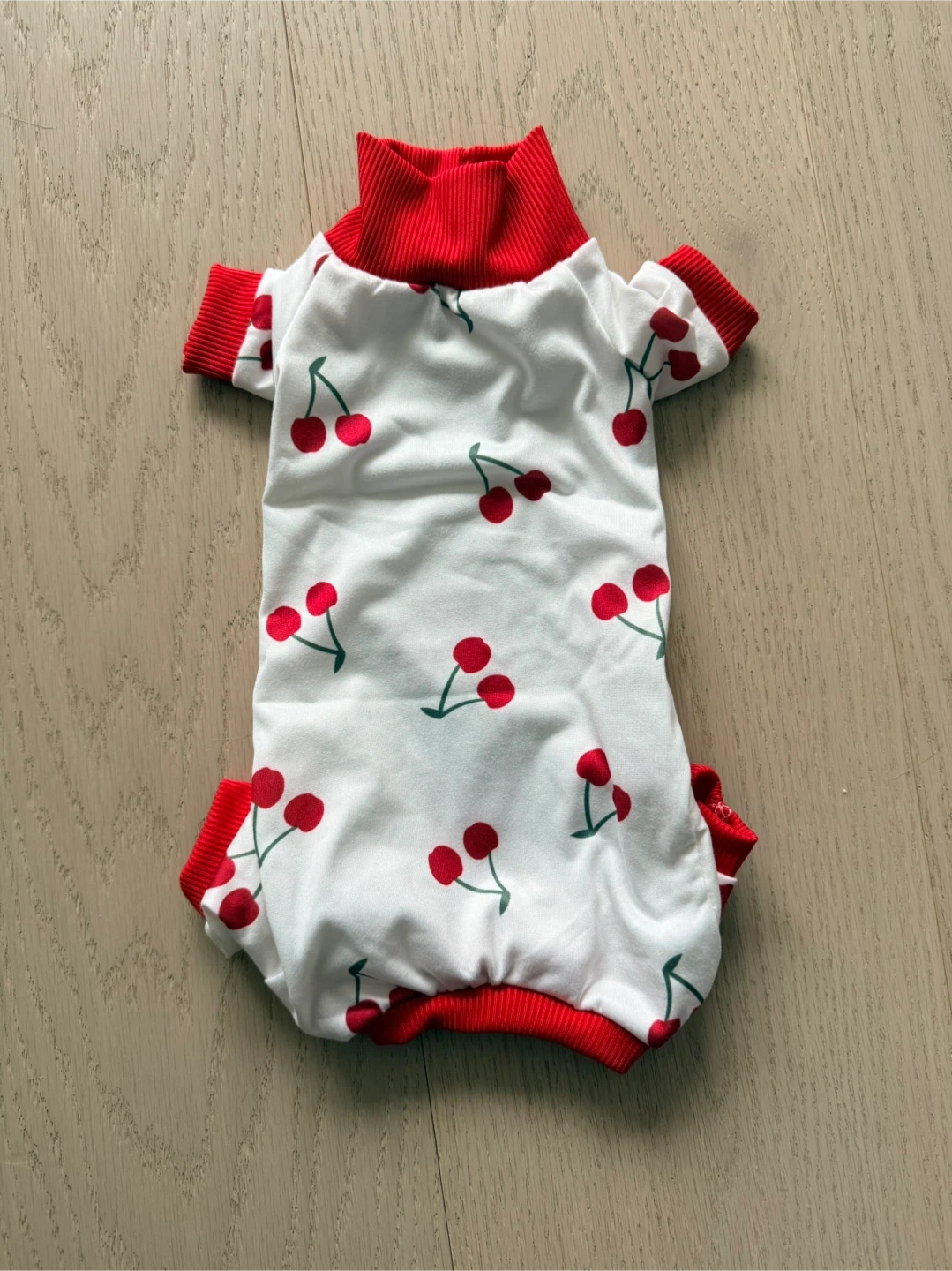 Cute white pet pajamas with a red cherry print and red trim. These PJs feature a high neckline and ribbed cuffs for extra comfort. Perfect for keeping your furry friend cozy!