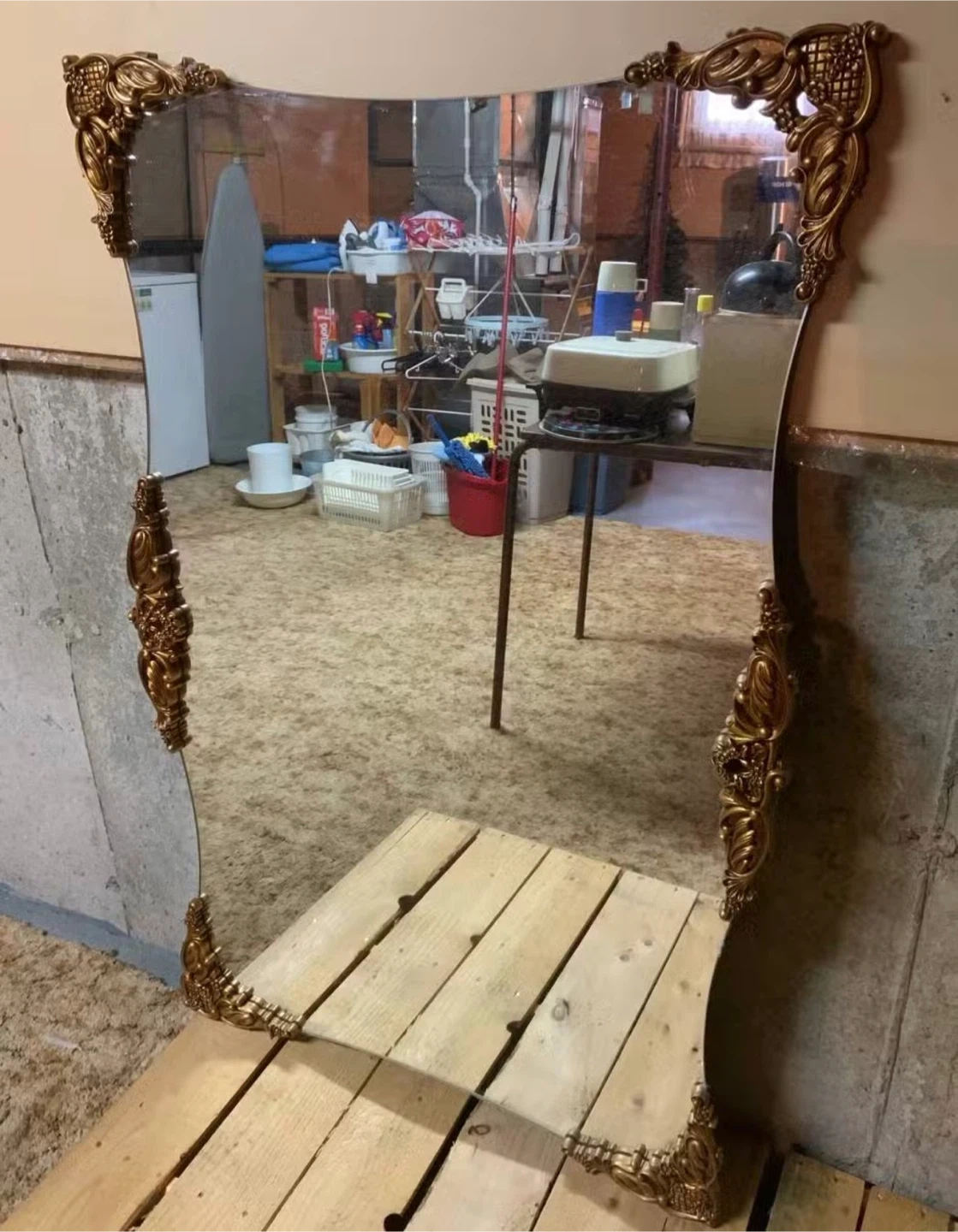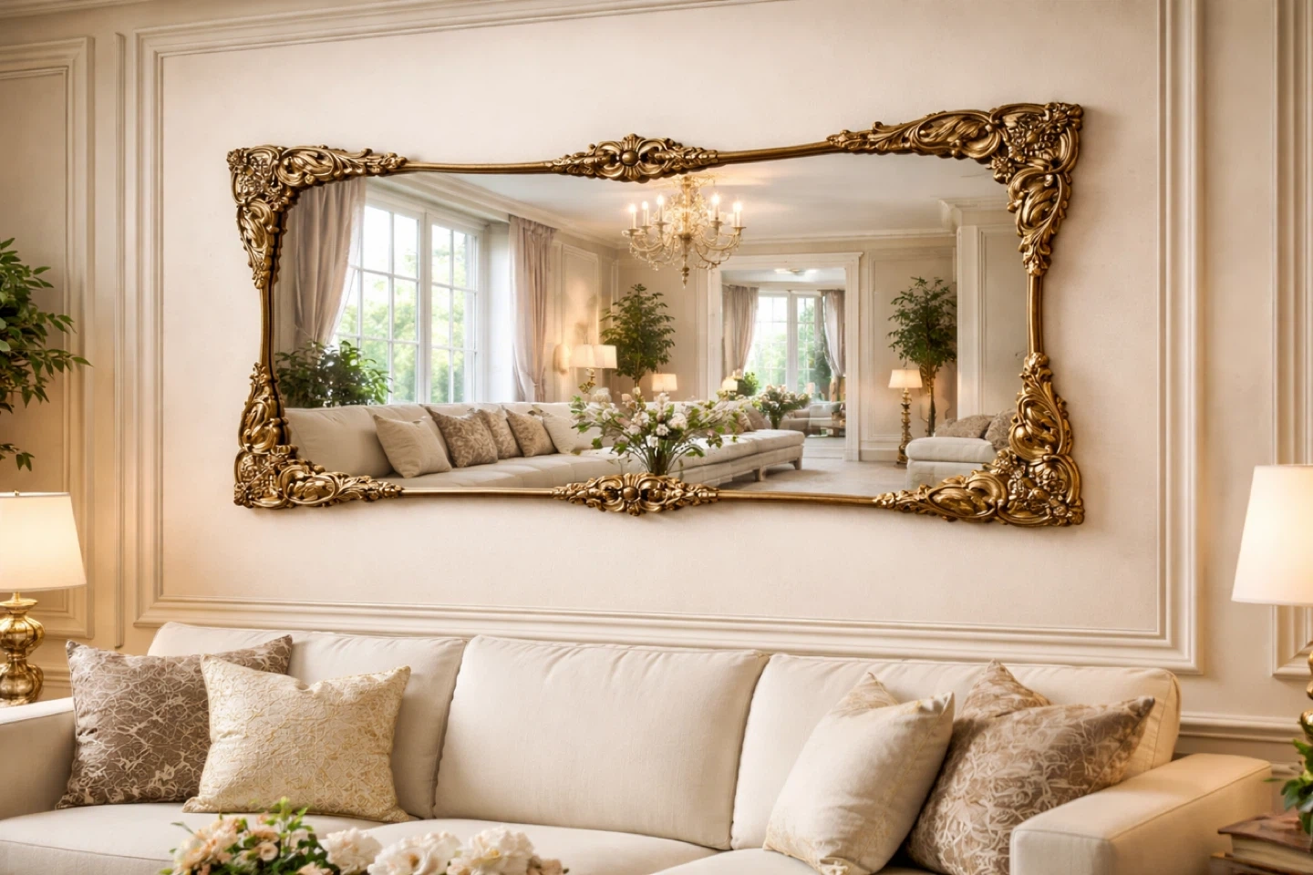 A beautiful decorative mirror with an ornate gold-coloured frame. The detailed scrollwork adds a touch of elegance. It's perfect for enhancing any room's decor.