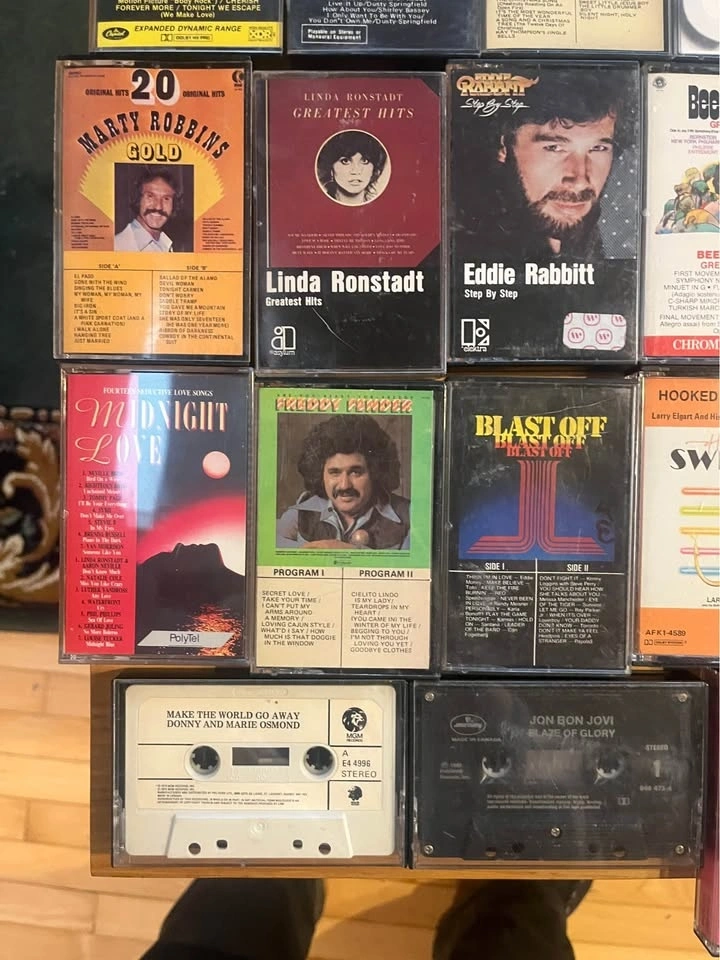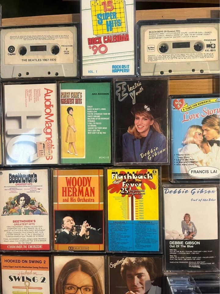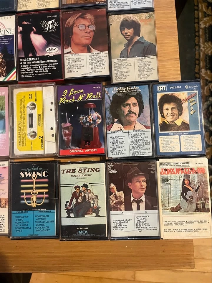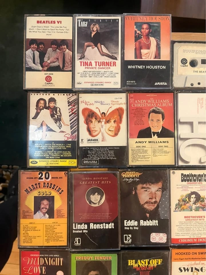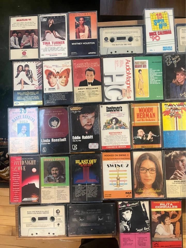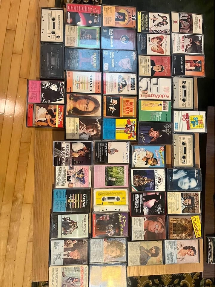 Assorted cassette collection from the 50s and newer, with about 50 tapes total. Includes artists like The Beatles, Tina Turner, Whitney Houston, Patsy Cline, John Denver, Frank Sinatra, and more. Please note that I haven't verified the contents or tested if all tapes work, so there might be a few duds. If there's anything specific you'd like me to check, feel free to ask!