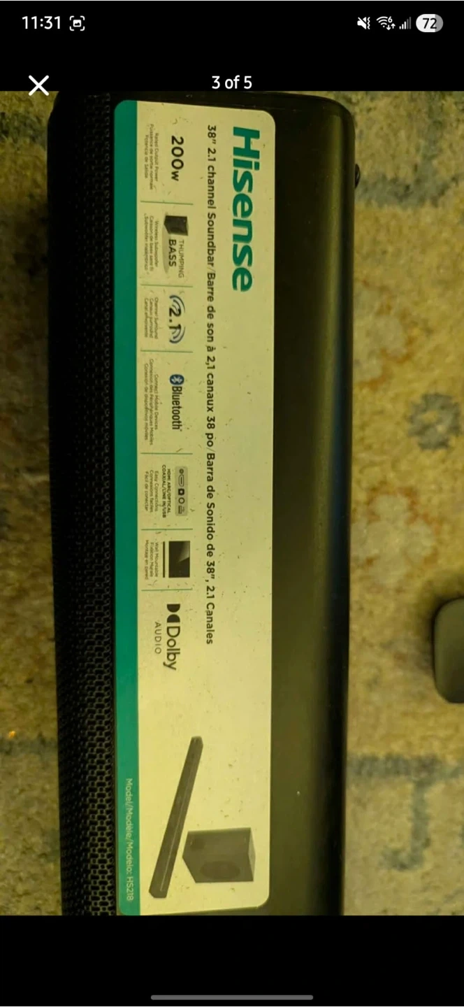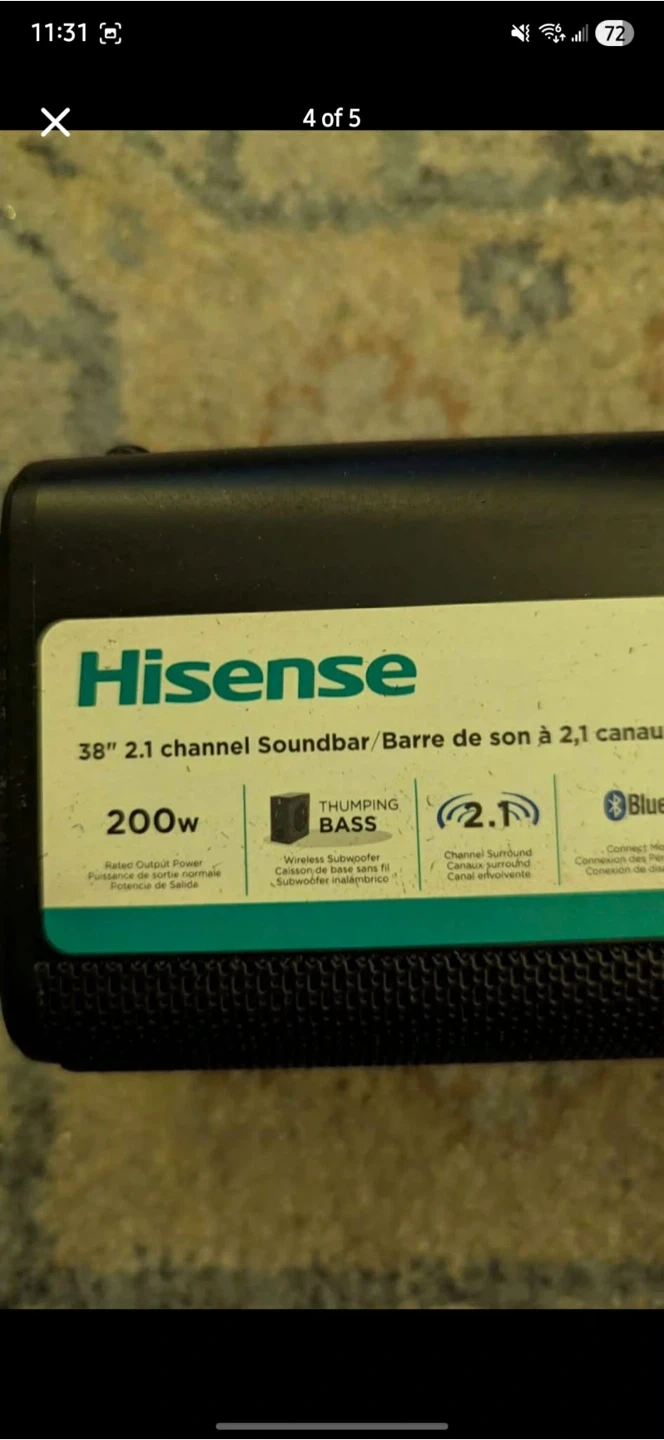 This Hisense 38-inch soundbar comes with a wireless subwoofer for thumping bass. It's a 2.1 channel system with Bluetooth connectivity. Includes remote and cables.
