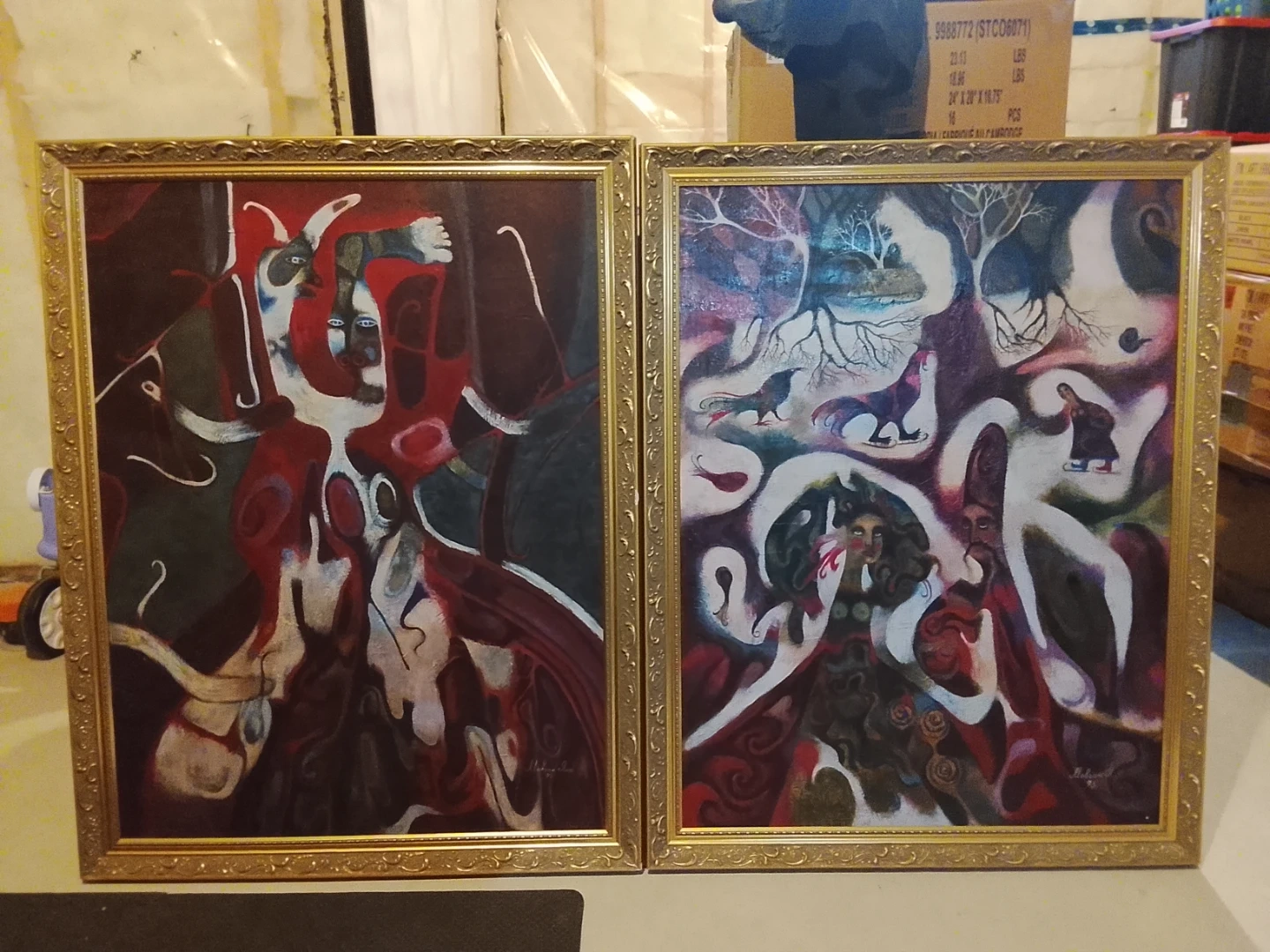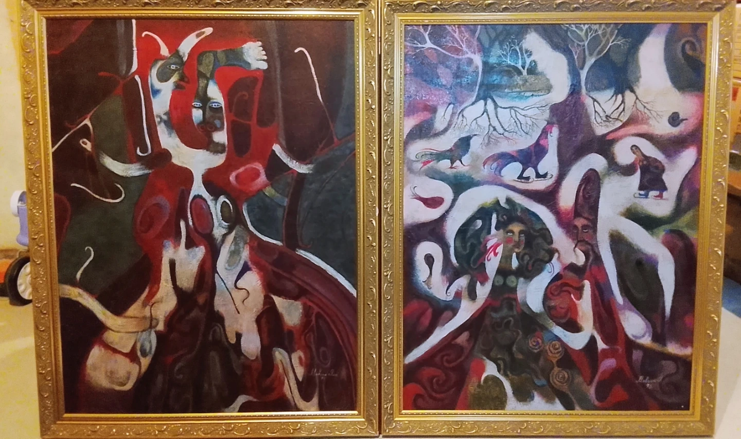 TWO ORIGINAL OIL PAINTINGS OF YHANA MOVCHAN FROM HER FIRST ABSTRACT SHE DID BEFORE SHE CHANCE IT WITH STILL LIFE WITH FLOWERS , BIRDS , AND PEOPLE . SHE A WELKNOWN ARTIST FROM UKRAINE MOVE IN CANADA . THIS TWO I BOUGHT FROM SHEARWAY GARDEN ART GALLERY IN 1990 'S PM ME I CAN TRADE WITH COINS . , OLD SPORTS CARDS ZISE OF THIS PAINT IS 34 inch WIDEX 48 inch HIGHT .PM ME ANYTIME . READY TO HUNG.
