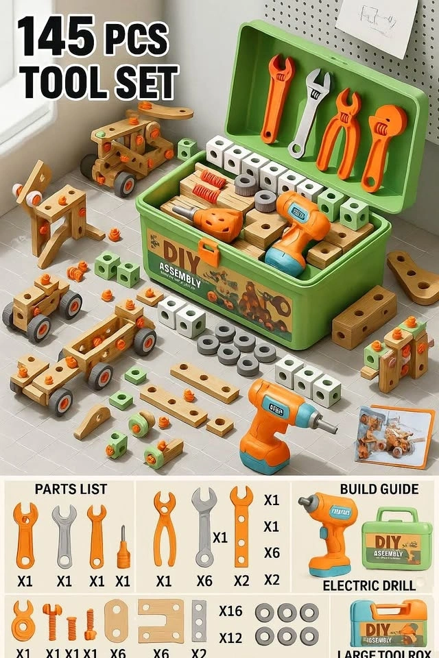 Selling a 145-piece DIY tool & construction set, perfect for kids who love building cars, robots, and all kinds of creative models. Encourages hands-on learning and imaginative play.
