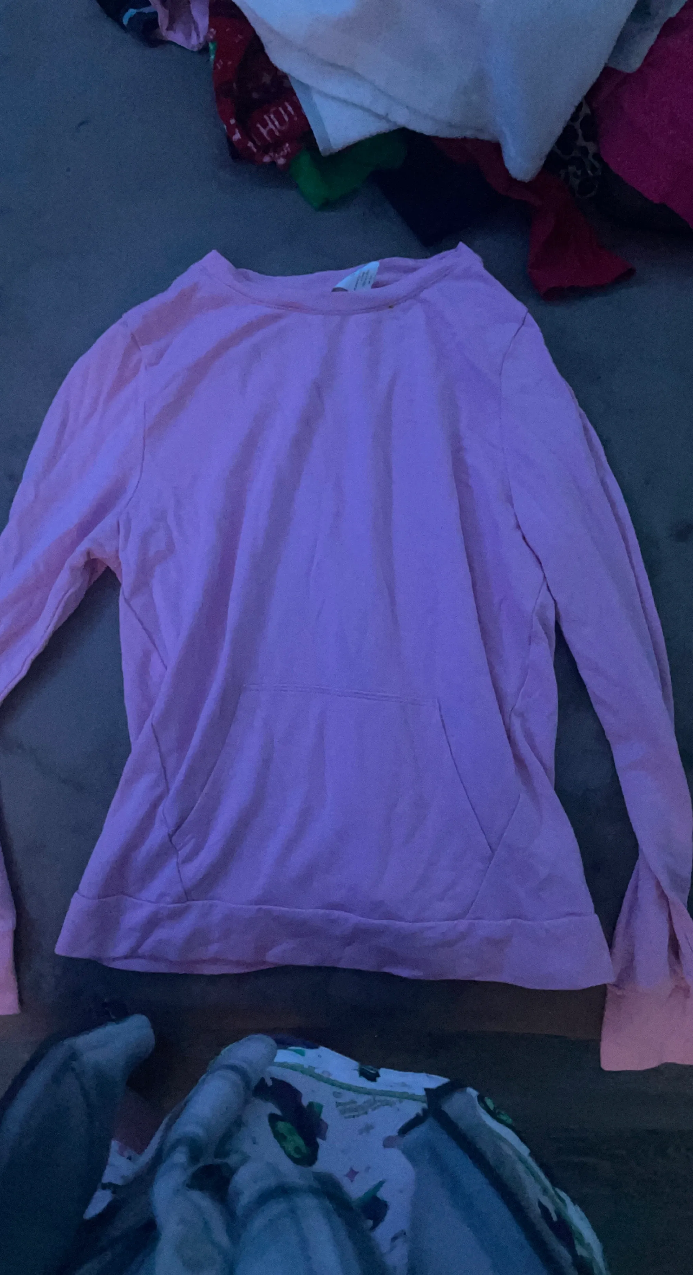 This is a pink long-sleeved top. It's made of a soft material and features a kangaroo pocket on the front. The sleeves have a slight flare at the cuffs.