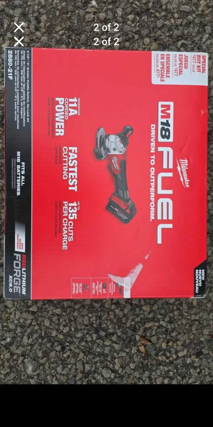 This is a Milwaukee M18 FUEL 18V cordless brushless grinder kit. It includes a 4.5/5in grinder, a FORGE 6.0Ah battery, and a charger. It's designed for extended power and faster cutting. FIRM PRICE CASH ONLY