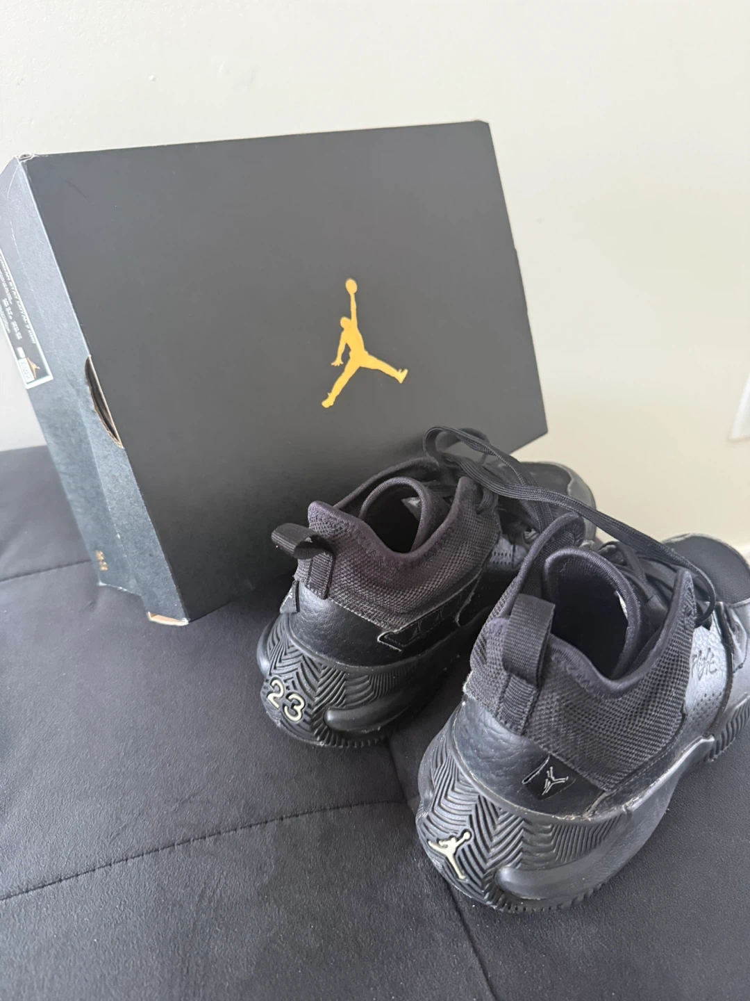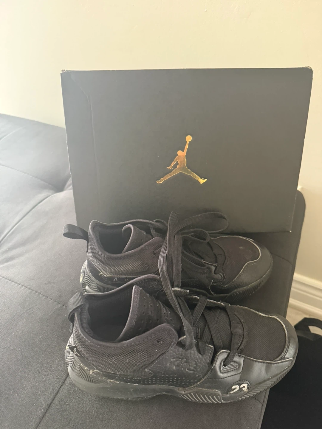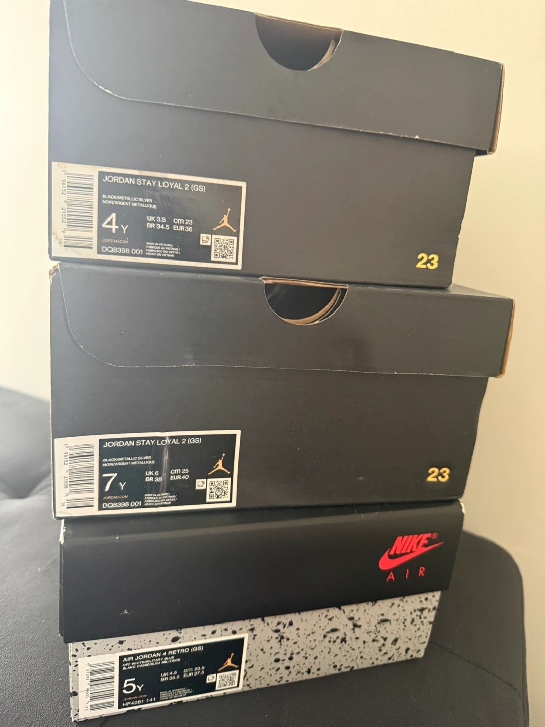 A pair of black Jordan kids' shoes. Includes original box. Also includes a pair of white and blue Jordan Flight shoes with their box. Lastly, a pair of white and black Jordan 7 shoes with their box.