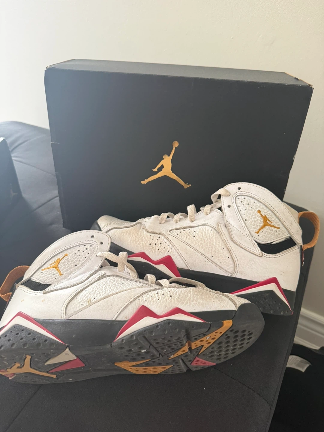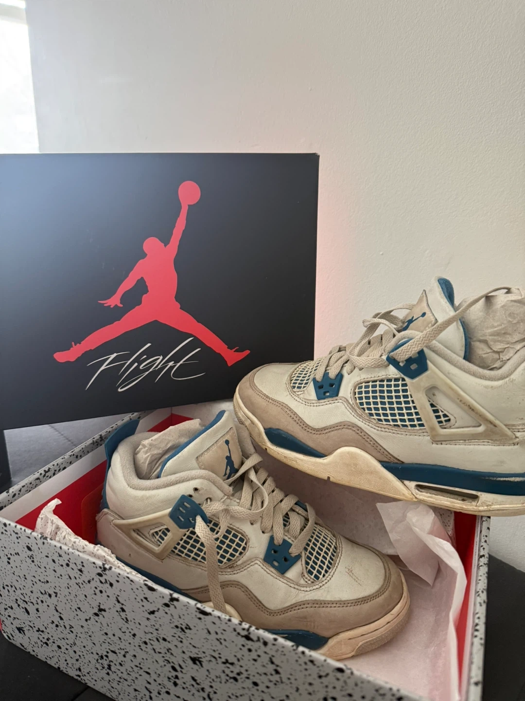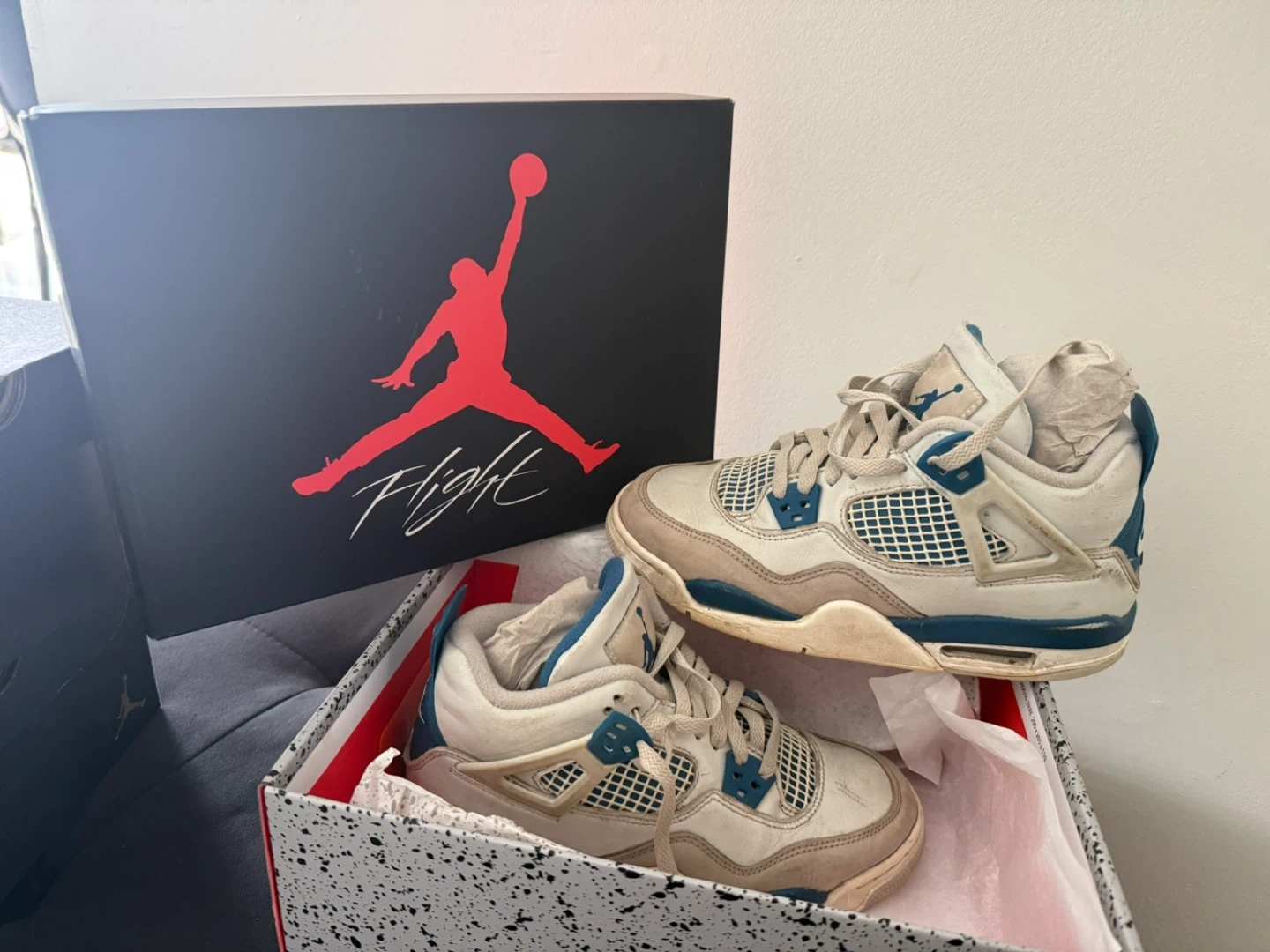 A pair of black Jordan kids' shoes. Includes original box. Also includes a pair of white and blue Jordan Flight shoes with their box. Lastly, a pair of white and black Jordan 7 shoes with their box.