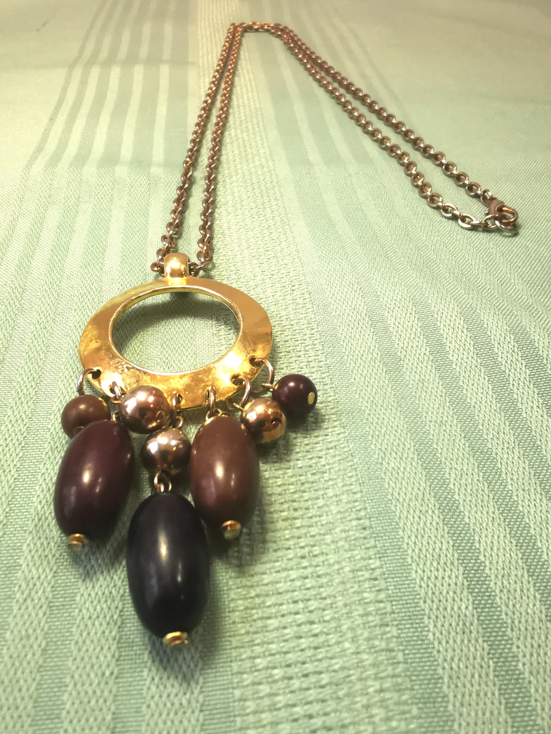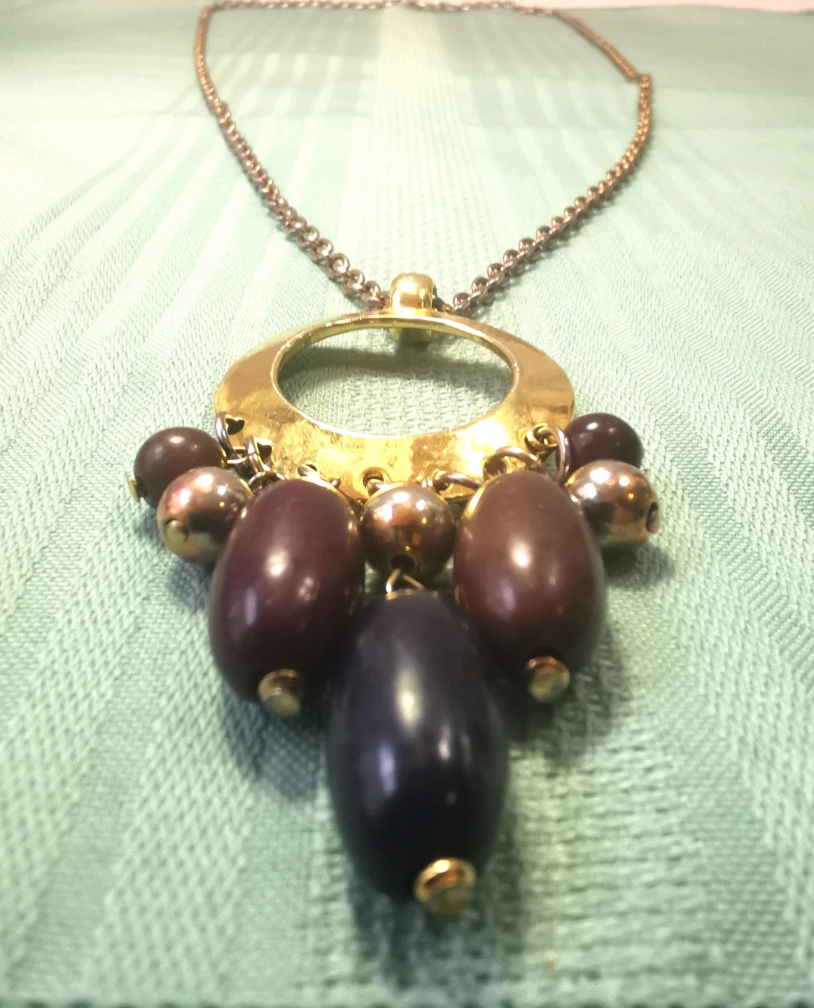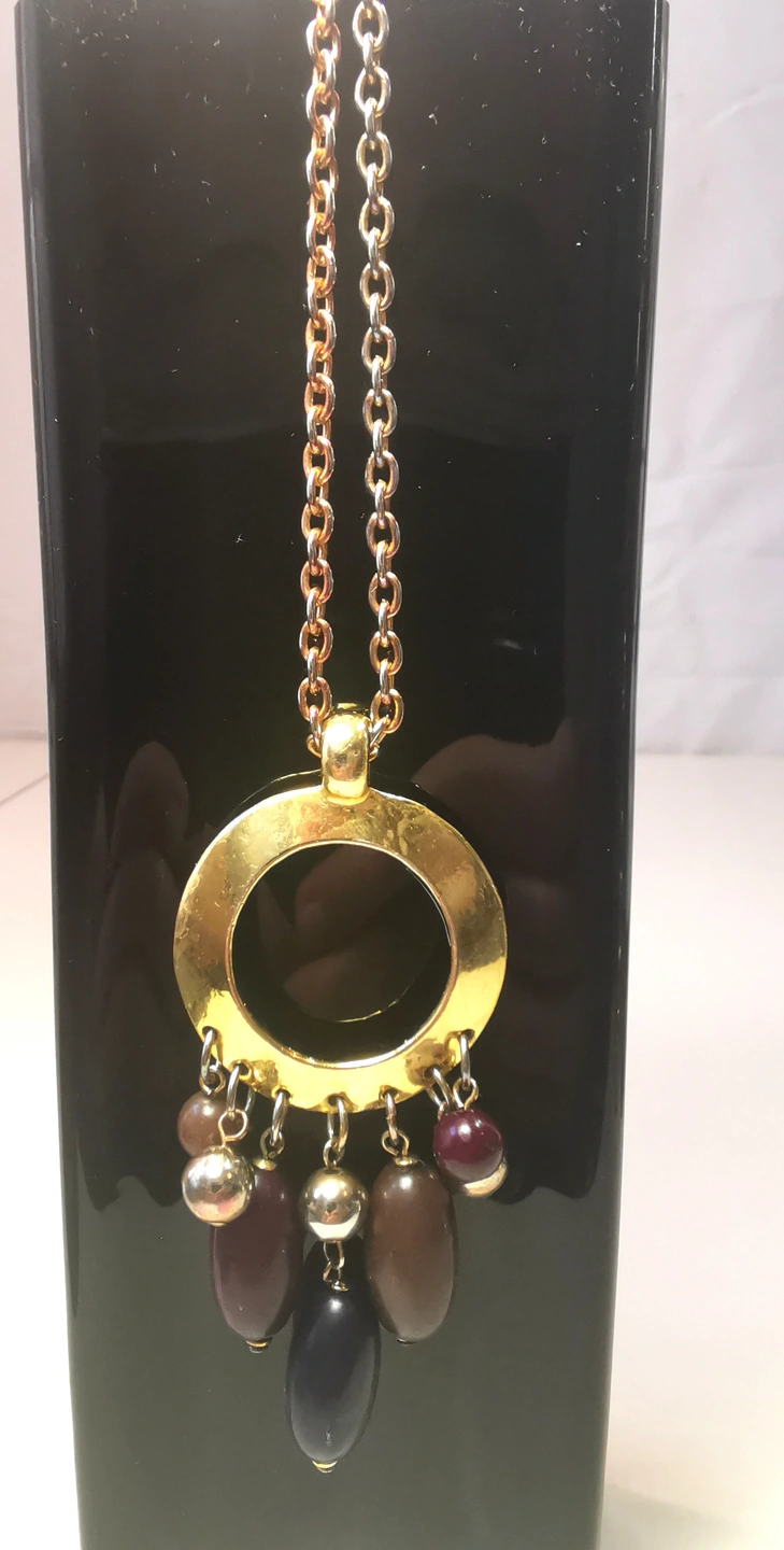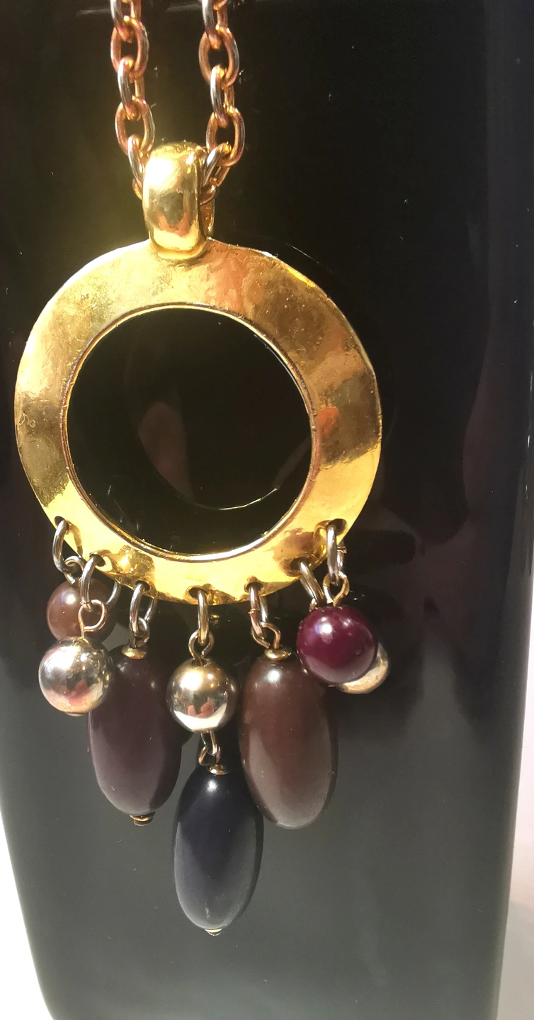 This is a substantial, runway-style piece from the early 1970s. The long chain and large pendant make it an ideal statement piece for layering or wearing over solid-colored fabrics.
