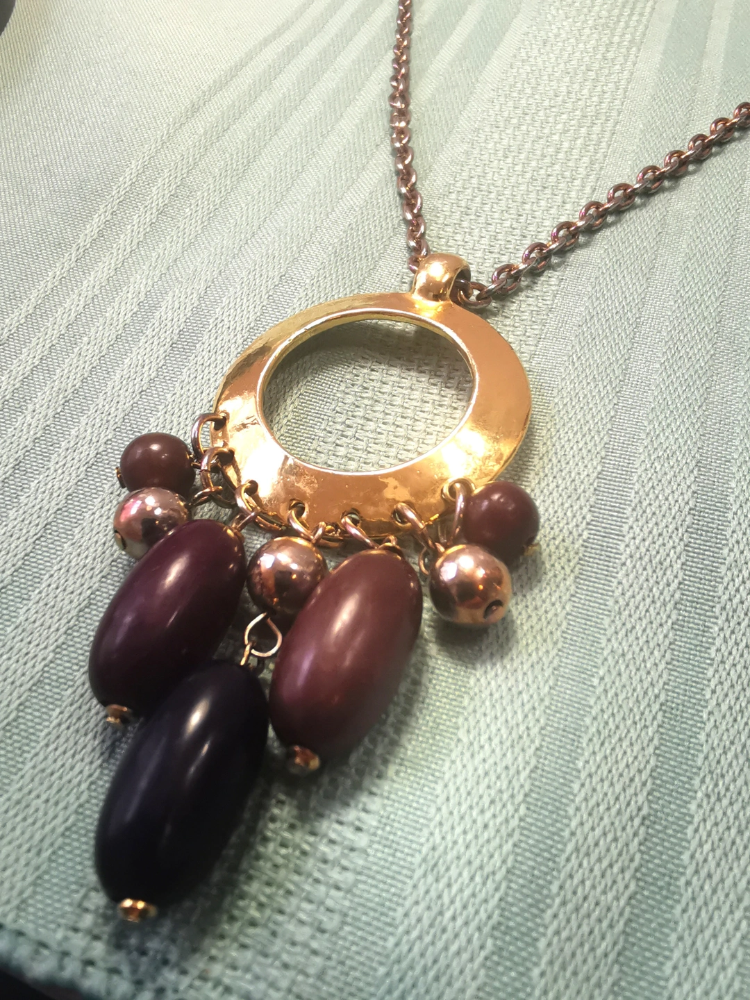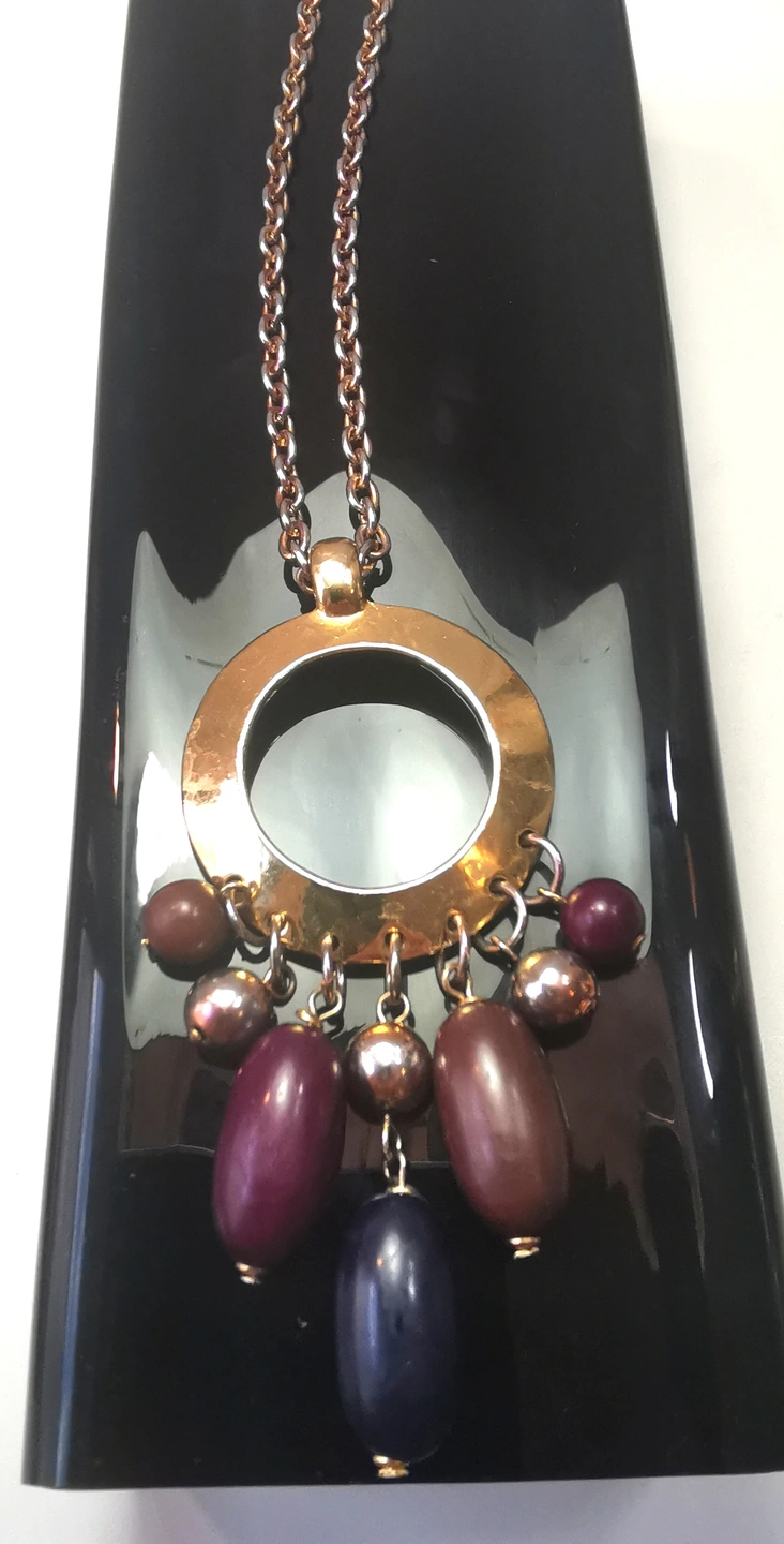 Design: Features a large, textured hammered-metal open circle holding a multi-strand tassel of colorful beads (amber, purple, and gold tones).