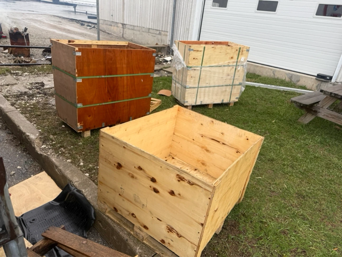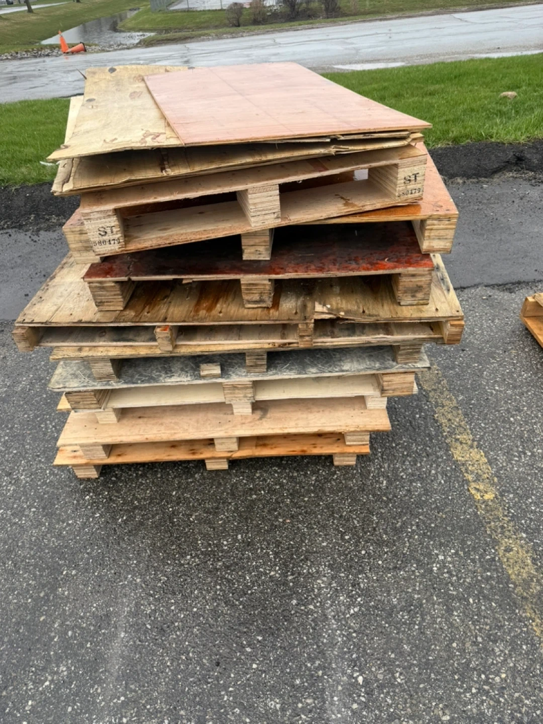 Stack of wooden pallets, some are heavier duty. Also includes a few large wooden crates, perfect for storage or shipping. Pallets are standard size. Crates are cube-shaped. Good for various uses!